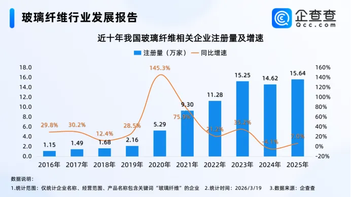 企查查数据显示,近十年,我国玻璃纤维相关企业注册量基本逐年增加,其中2020年注册量同比大幅增加145.3%至5.29万家,达近十年注册量增速峰值,2025年全年,我国累计注册15.64万家玻璃纤维相关企业,同比增加7.0%。截至3月19日,2026年我国已注册2.86万家玻璃纤维相关企业。