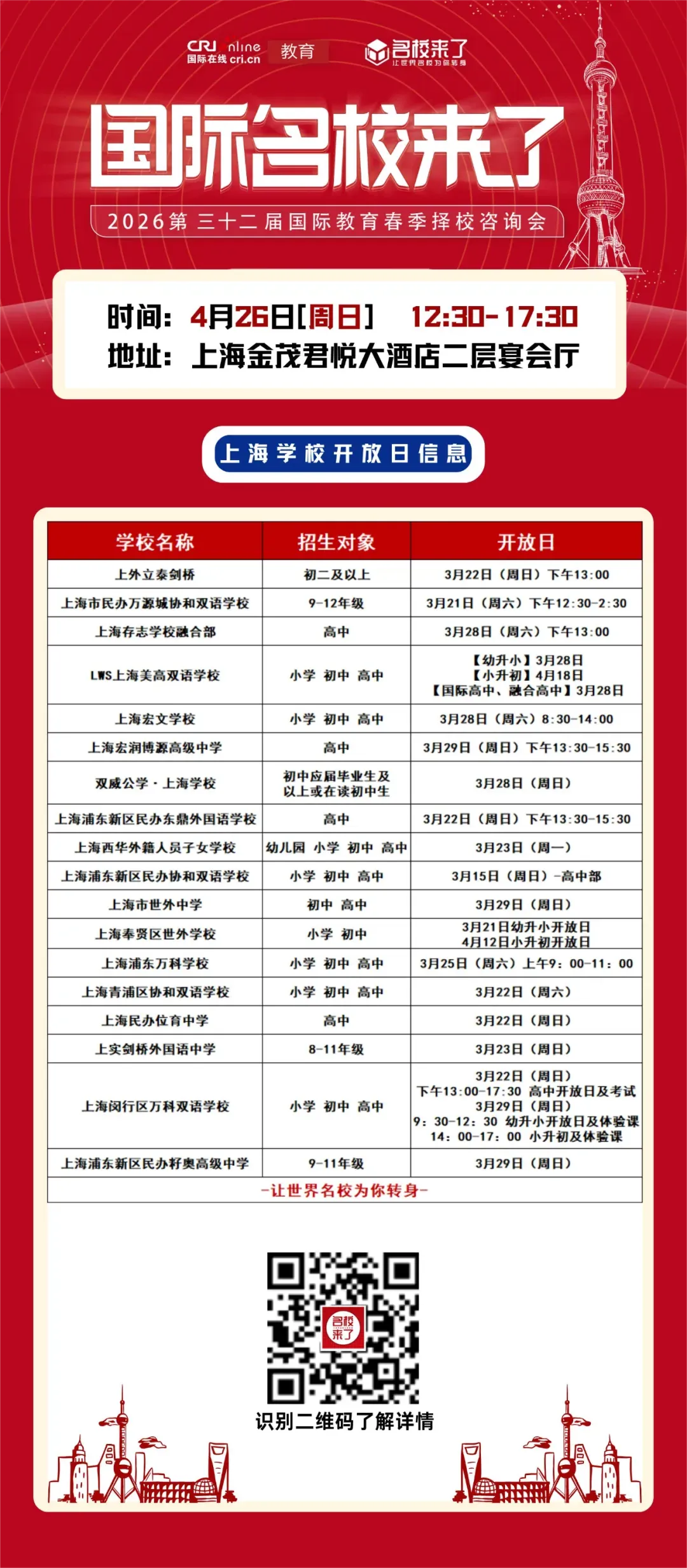 为了帮助广大有意转轨多元化教育、尝试双轨制教育的家庭提供更好的择校规划,一站式解决择校难题,上海第三十二届国际名校来了多元化升学择校咨询会将于4月26号[周日]在上海金茂君悦大酒店2层宴会厅举办。现场邀请上海50多所优质多元化学校、双轨制学校的校长/招生官与家长面对面沟通,数十位校长大咖和择校专家发表演讲,还有多位不同领域的升学规划专家为家长一对一答疑,欢迎点击下方链接预约报名!