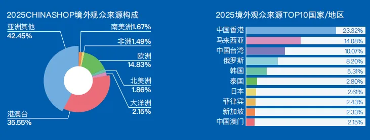 CHINASHOP国际影响力与年递增,在技术领先、理念超前的专业性根基和每年持续扩大的海外市场营销 投入下,境外观众每年持续增长,在2023年后,更是大幅提升,让展商不出国门,也能拓展海外买家。
