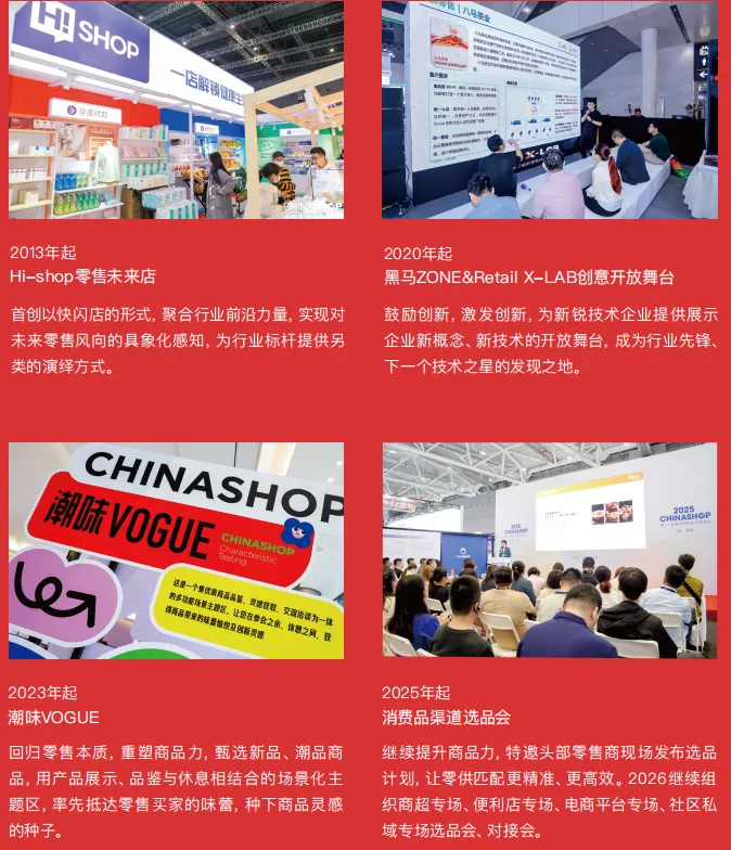 每年CHINASHOP都会基于对行业的洞察,不断推陈出新,策划推出新的展区、新的活动,为展商提供不拘 泥于展台形式的多维展示、互动交流机会。