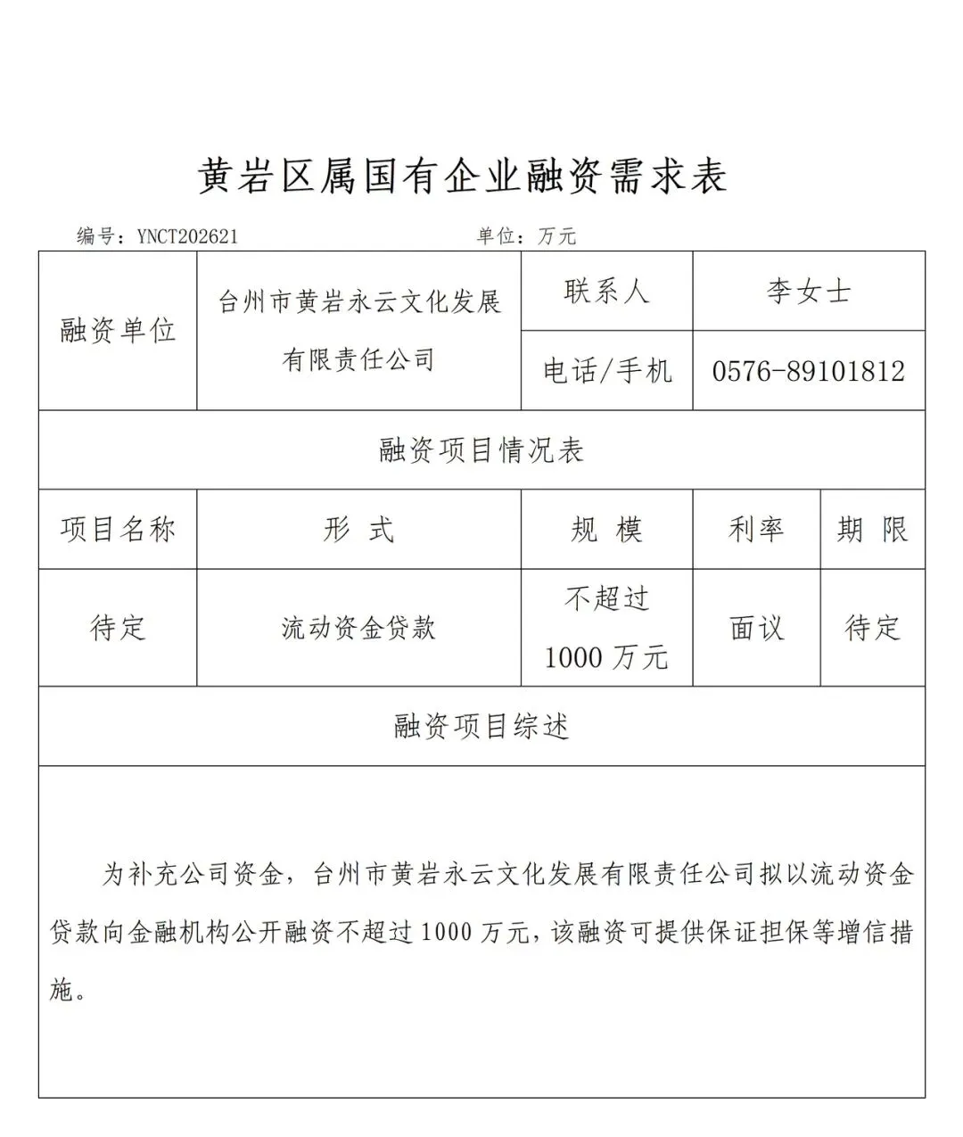 黄岩区属国有企业(永云文化公司)发布融资需求