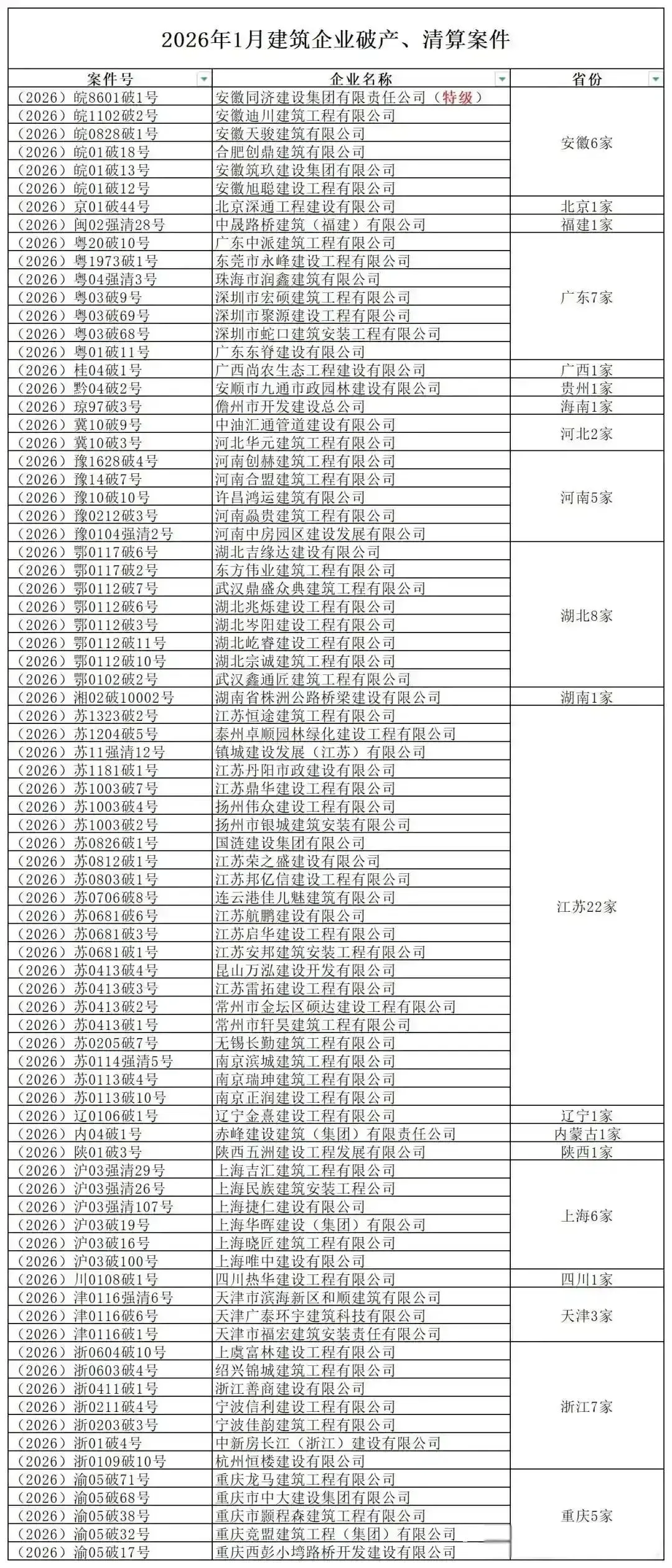 曾经作为国民经济支柱产业、承载城市化进程与基建发展重任的建筑行业,如今正经历着前所未有的阵痛,而东部沿海地区作为昔日行业发展的“黄金沃土”,反倒成为企业破产的重灾区,江苏一省便独占22家,广东、浙江、上海等地合计数十家,区域分布的高度集中,更是将行业潜藏的风险暴露。