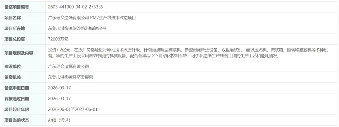 3月17日,广东理文造纸有限公司PM7生产线技术改造项目正式完成备案,项目总投资7.2亿,将在原厂房选址进行原地技术改造升级,聚焦设备焕新与工艺优化,持续提升生产效能与环保水平。