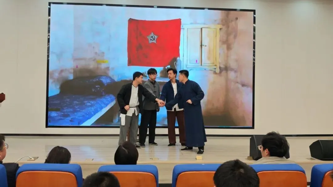 这是焦裕禄的入党时刻,也是千千万万青年共产党人初心的缩影。简陋的屋舍、鲜红的党旗、年轻而坚毅的面庞——舞台上,焦裕禄紧握右拳,眼神如炬,那句“不怕困难,永远为党工作,要做群众的模范……”的入党誓词,让在场师生无不动容。没有豪言壮语的铺垫,只有一位农村青年最朴素也最坚定的选择:把个人的命运,交给党和人民。