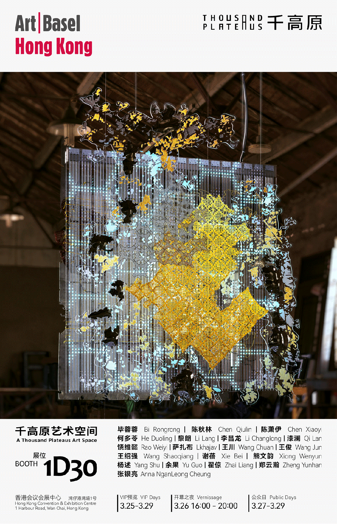 千高原艺术空间欣然宣布参加2026巴塞尔艺术展香港展会,我们将于3月25至3月29日在主展区艺廊荟萃(Galleries)呈现毕蓉蓉、陈秋林、陈萧伊、何多苓、黎朗、李昌龙、漆澜、饶维懿、萨扎布、王川、王俊、王绍强、谢蓓、熊文韵、杨述、余果、翟倞、张银亮、郑云瀚等艺术家的绘画、装置、录像及摄影作品,展位号1D30。