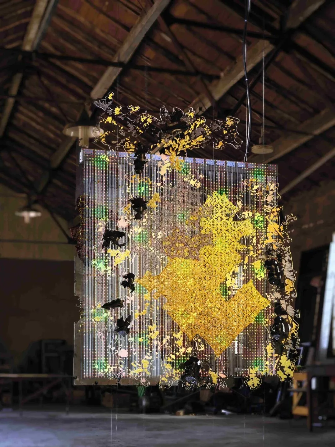 One of three works selected for Art Basel Hong Kong 2026's advertising campaign, Stitched Urban Skin (2022) draws inspiration from layered urban landscapes. The work is a weaving of tradition and innovation: composed of three two-dimensional layers, it features specially forged metal, LED screens with flickering light points, and plexiglass interwoven with traditional Chinese crochet techniques. While merging ancient craftsmanship with innovative technology, the artist also interconnects different times and spaces.