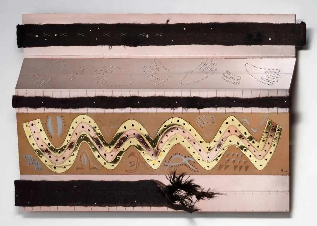 ▲毕蓉蓉,南方·北方—移动的建筑-星星,黄铜板,紫铜板,紫铜板上真空离子镀膜(PVD),紫铜板上油画颜料、墨、银粉、铜粉绘画,牦牛帐篷布碎片,施华洛世奇水晶,合金铜丝缝合,68.5(H) × 101(W) × 7(D) cm,2026 ©艺术家及千高原艺术空间