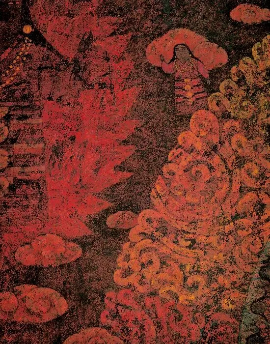 Xiong Wenyun (b. 1955) was born in Chongqing. She received a BA in Chinese Painting from the Sichuan Fine Arts Institute in 1983 and an MA in Japanese Painting from the Graduate School of Art at the University of Tsukuba, Japan, in 1993. Xiong skillfully employs the laborious technical processes and mineral pigments characteristic of Japanese painting to depict the Tibetan atmosphere and the image of a Tibetan woman in Flame (1994). The artist views the human landscape of the snow-capped regions of Sichuan and Tibet as something simple and mysterious, which coincides perfectly with the stable, harmonious, delicate, brilliant, yet tranquil temperament found in Japanese painting. Her creative process is like that of a sincere Tibetan woman continuously turning the prayer wheels in the temple corridors, drawing closer to her inner hopes through seemingly repetitive labor. Through a process of reflection, Xiong distills the folk scenes she has witnessed into a series of serene spiritual images, which hold profound significance for her inner world.