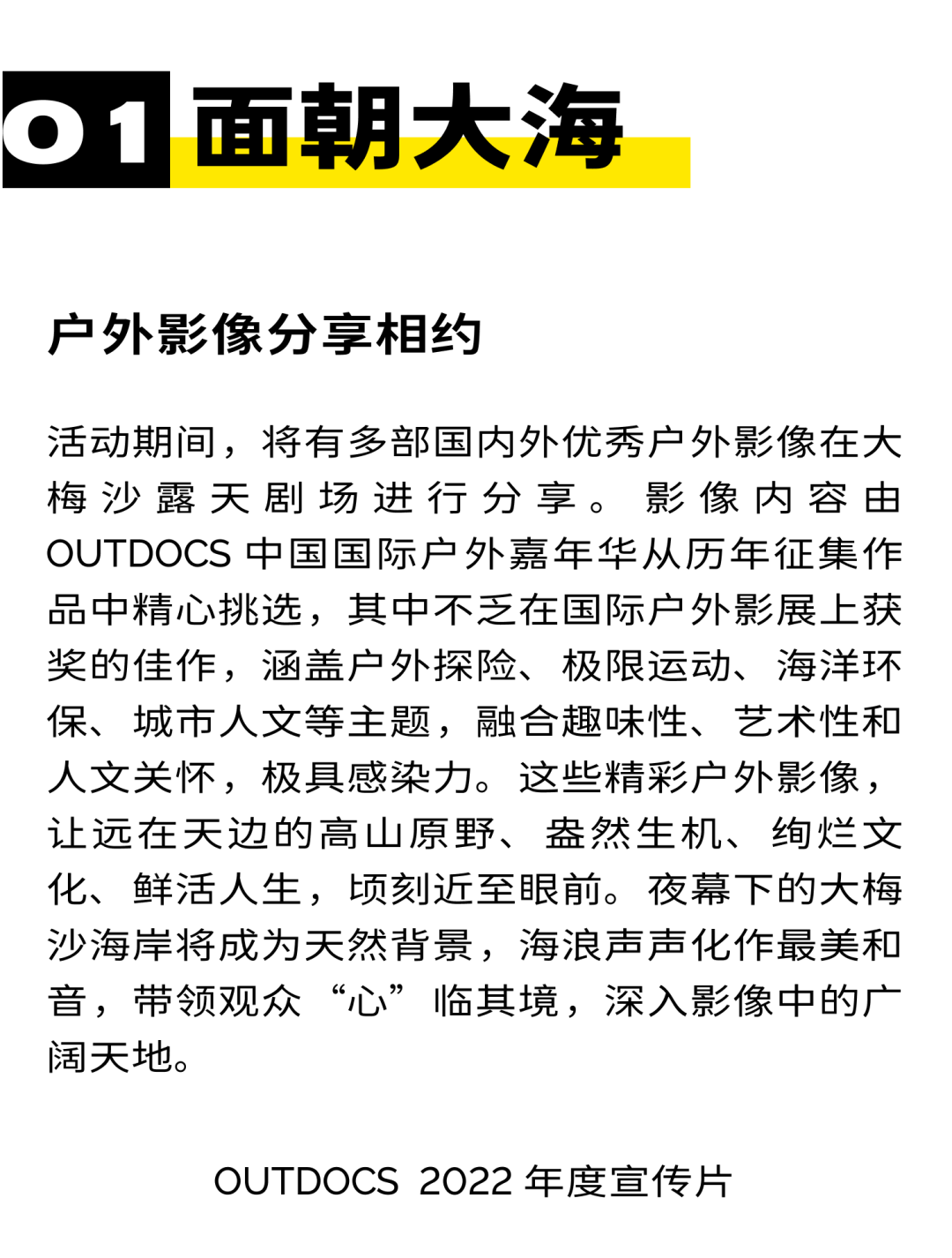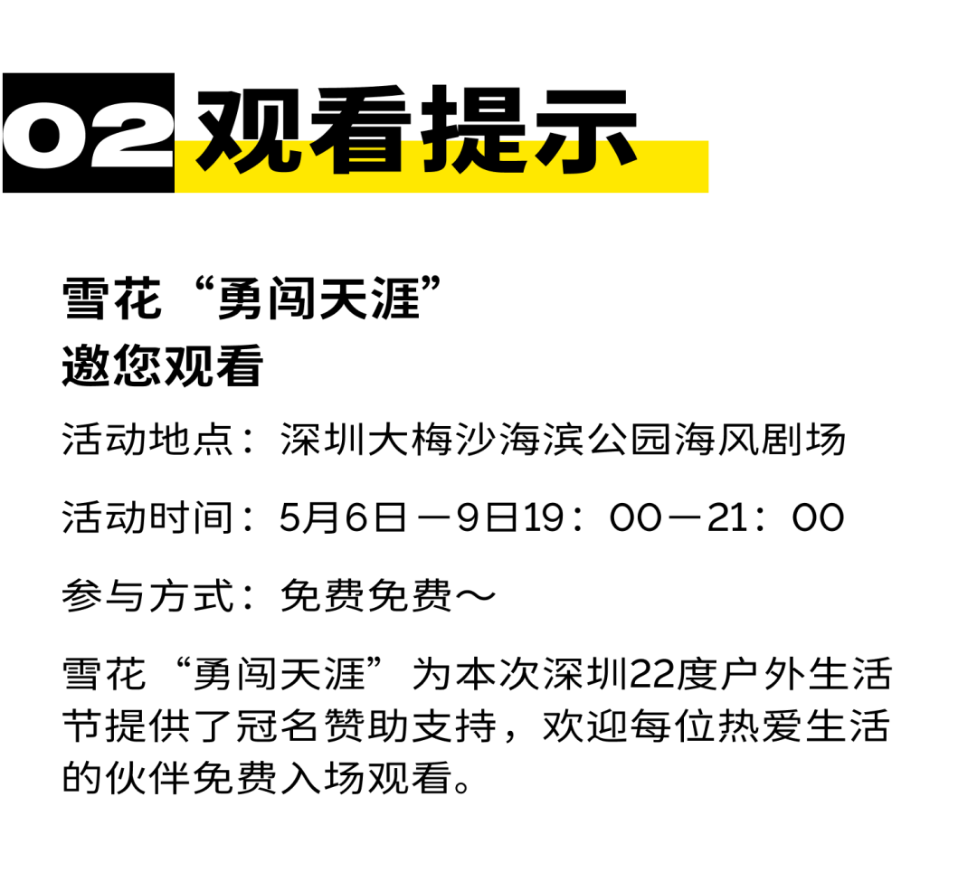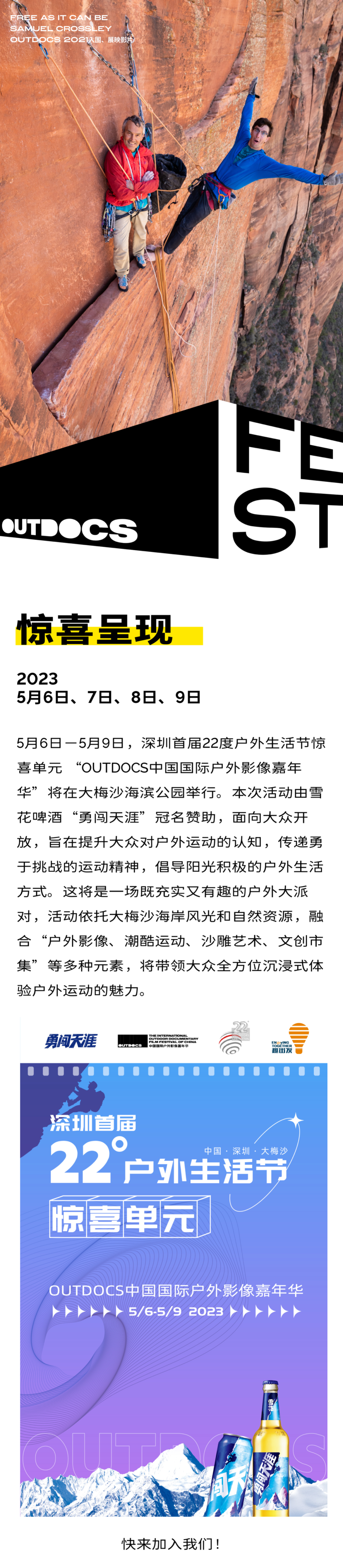 5月6日至5月9日,OUTDOCS中国国际户外影像嘉年华于深圳首届22度户外生活节惊喜亮相,海内外优秀户外影像欣赏、达人探险故事分享等精彩活动等你畅玩。快来深圳大梅沙海滨公园和我们一起“勇闯天涯”!