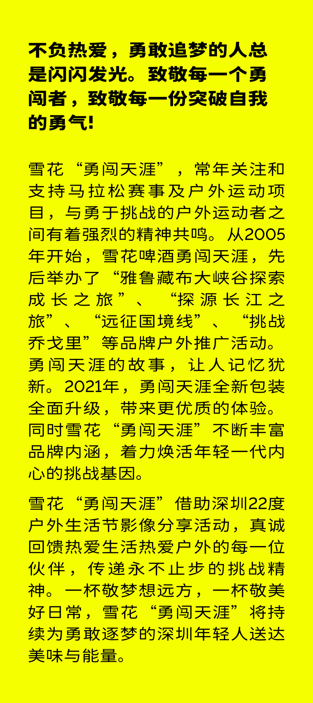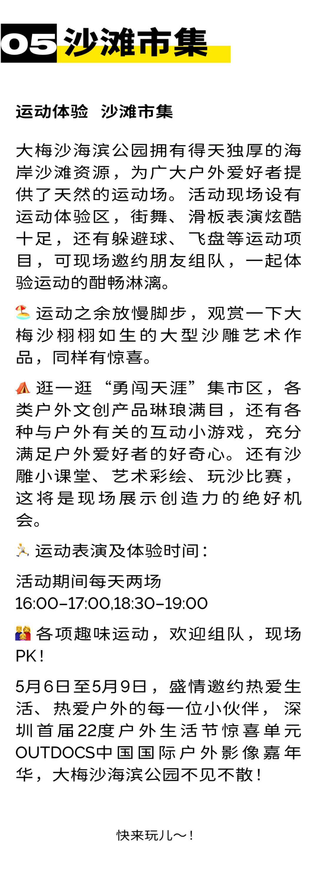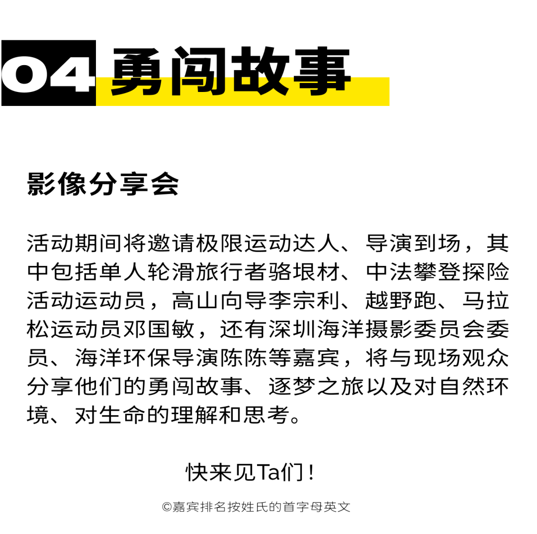 5月6日至5月9日,OUTDOCS中国国际户外影像嘉年华于深圳首届22度户外生活节惊喜亮相,海内外优秀户外影像欣赏、达人探险故事分享等精彩活动等你畅玩。快来深圳大梅沙海滨公园和我们一起“勇闯天涯”!