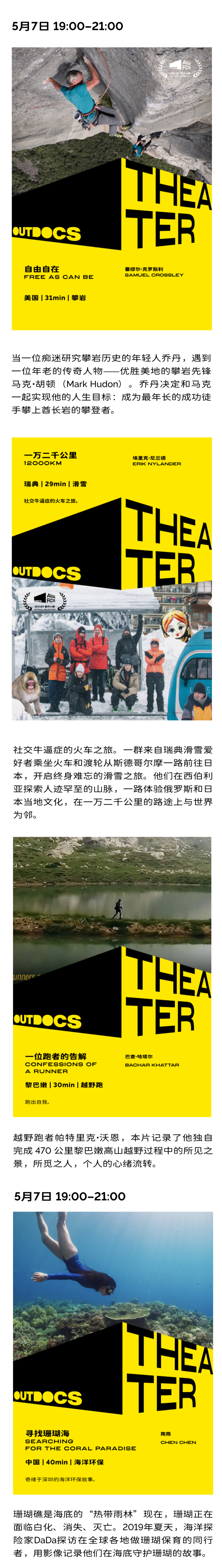 中国国际户外影像嘉年华(OUTDOCS)是国内知名的户外影像文化品牌,以纪实影像为载体,助力文旅、体育、自然环保与影像事业发展,通过国际征集评选、市场交易、专业论坛、国际培训、户外集市、文化体验和公众展映等系列户外文旅体育推广活动,整合全产业资源最大化发挥,促进产业交流、交易与合作,向公众传递健康积极的生活方式。为表彰优秀户外纪录片与创作者,向大众传播优质的户外文化,打造探险运动、户外文化、自然环保等题材影像的人文价值高地,OUTDOCS自2019年开始,设立竞赛与公众展演项目,向全球征集户外类纪实影片,迄今已收到超过100个国家/地区3000余部作品。年度户外影像征集全新升级,即将开启,敬请期待!