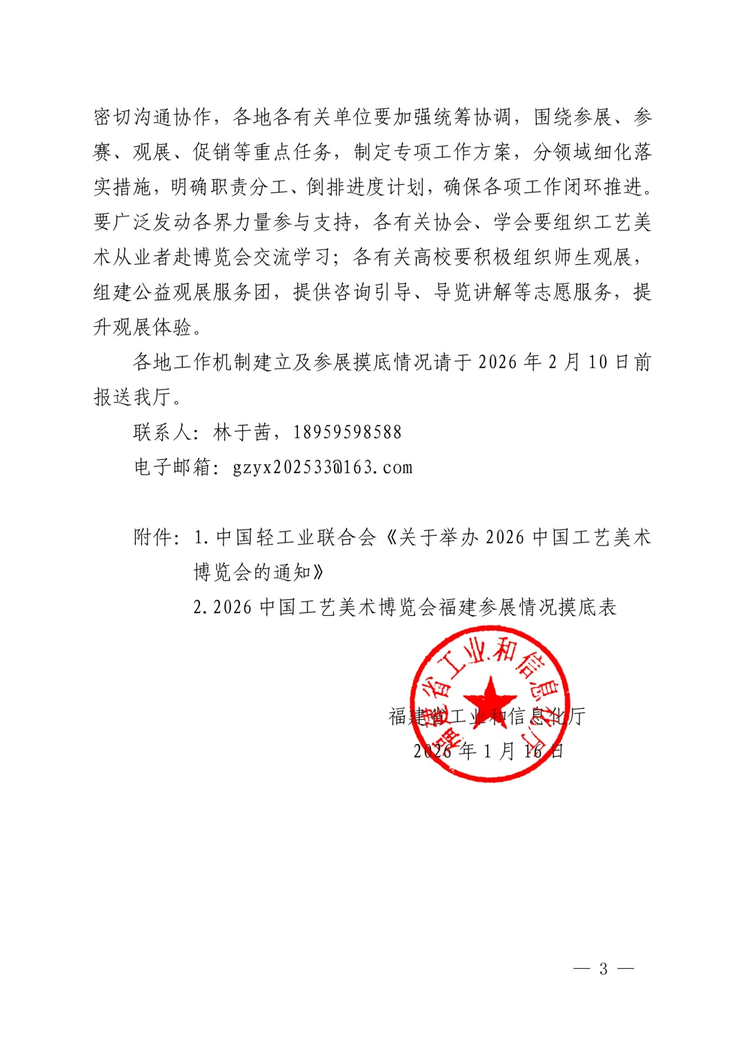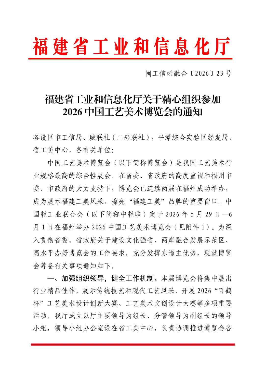 依据福建省工业和信息化厅《关于精心组织参与2026中国工艺美术博览会的通知》(闽工信函融合[2026]23号),中国轻工业联合会定于2026年5月29日—6月1日在福州举办2026中国工艺美术博览会。为大力弘扬厦门优秀传统文化,集中展示厦门工艺美术精品,展现厦门城市品牌形象,助推厦门市工艺美术产业高质量发展,厦门市工艺美术协会拟组织我市工艺美术精品赴福州参展参评。现将我市组织参加本次博览会的有关事项通知如下: