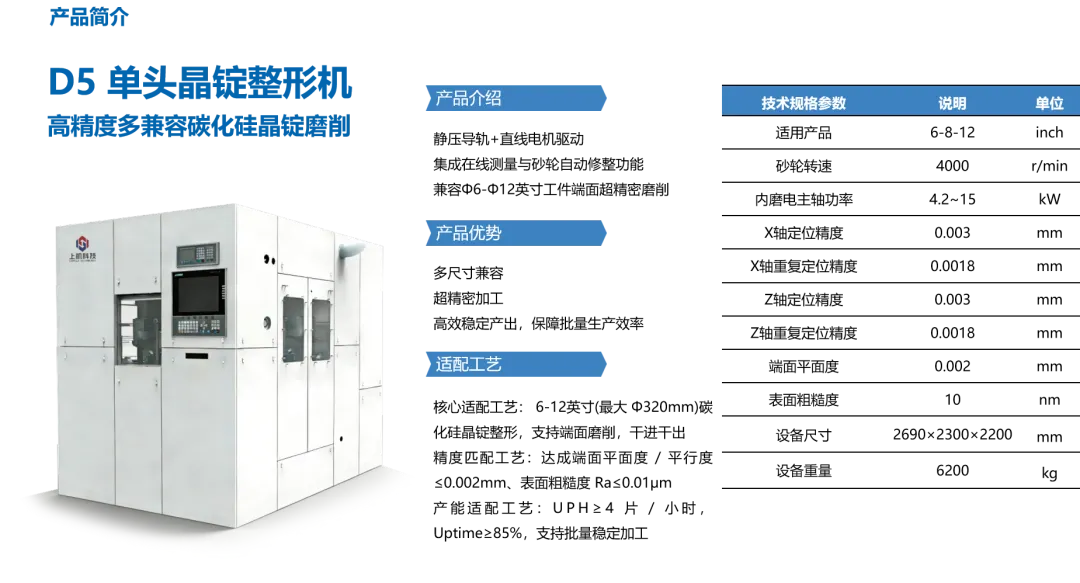 在即将到来的SEMICON CHINA 2026展会上,我们将为您展示一款革命性的设备——D5单头晶锭整形机。D5以其卓越的性能和创新的技术,为碳化硅晶锭加工领域带来了全新的解决方案。让我们一起抢先一睹其风采。D5单头晶锭整形机集成了高刚性传动系统、纳米级在线测量技术、智能磨削与洁净加工一体化方案等,为碳化硅晶锭加工带来亚微米级精度与高效稳定表现。无论是 Φ6-Φ12 英寸(最大 Φ320mm)的大尺寸工件,还是厚度达 100mm 的硬脆材料,设备都能精准驾驭,满足高精度整形与低损伤加工的严苛需求。本微信公众号旨在提供上海上机科技有限公司的相关信息,不构成信息披露和投资推荐,仅供上海上机科技有限公司宣传目的。