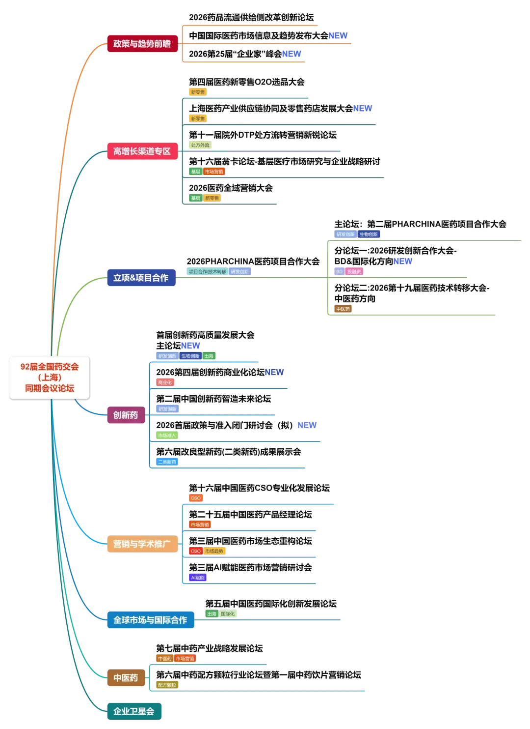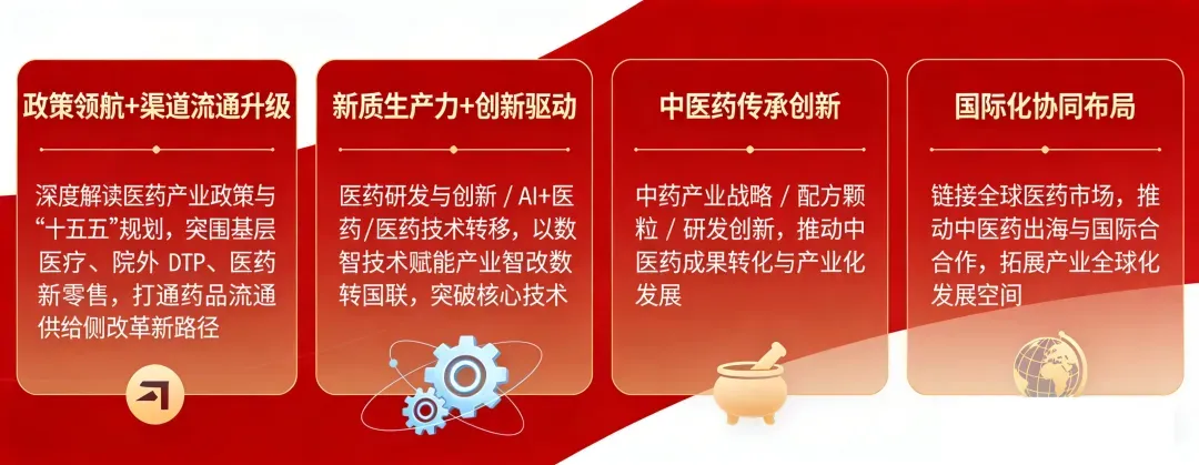 八大核心板块涵盖政策与趋势前瞻、创新药、高增长渠道、营销与学术推广、立项&项目合作、全球市场与国际合作、中医药及企业卫星会