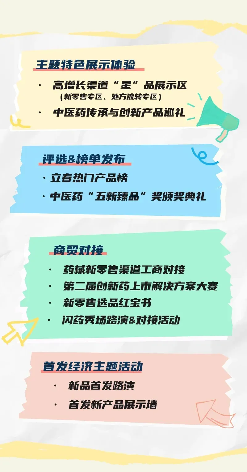 本届展会将围绕主题特色展示体验、评选 & 榜单发布、商贸对接、首发经济主题活动四大板块,精心打造多元活动矩阵,为展商与观众搭建起展示窗口、互动桥梁与沉浸式体验场景,以丰富形式焕新医药行业活力,赋能产业高效对接与价值升级。更多活动敬请期待!