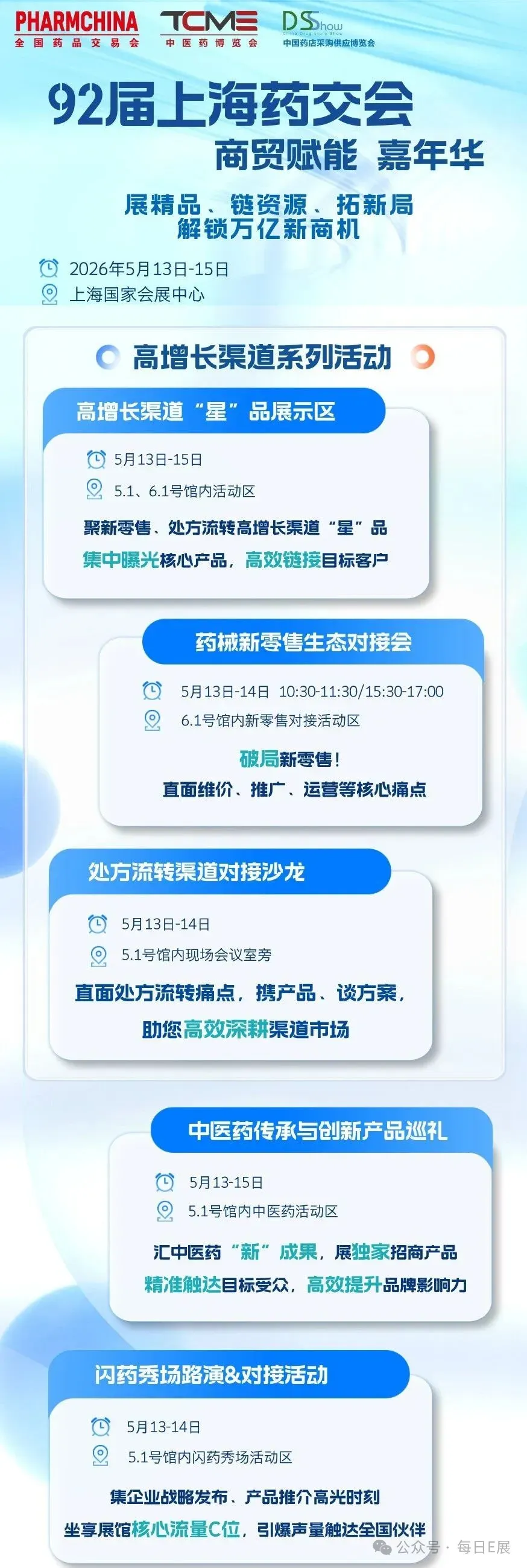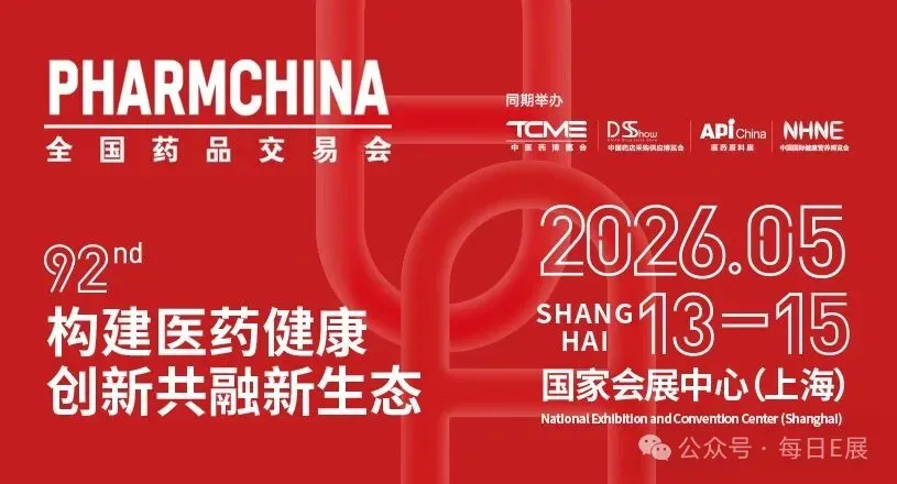 由国药励展主办的第92届全国药品交易会(PHARMCHINA)、2026中国国际健康营养博览会(NHNE)、第94届中国国际医药原料药/中间体/包装/设备交易会(API China)将于2026年5月13-15日在国家会展中心(上海)举办。