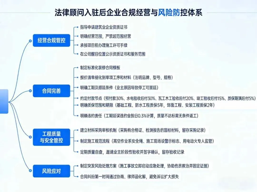 法律顾问入驻后,为企业搭建了全流程合规经营与风险防控体系:一是经营合规管控,指导企业按规定申请建筑业企业资质证书,明确经营范围,严禁超范围经营;承接项目前办理齐全施工许可手续,确保合法施工;在公司醒目位置公示资质证书和服务范围。二是合同完善,制定标准化装修合同模板,明确核心条款:报价清单细化到单项工序和材料(注明品牌、型号、规格),避免漏项增项纠纷;明确工期及顺延条件(如业主原因导致停工可顺延);约定付款节点(预付款30%、水电验收后付 30%、瓦工木工验收后付 20%、竣工验收后付 15%、质保期满后付 5%);明确质保范围和期限(基础工程、防水工程质保 5 年,饰面工程、安装工程质保 2 年);明确违约责任(工期延误违约金按日 0.3% 计算,质量不达标需无条件返工)。三是工程质量与安全管控,指导企业建立材料采购审核机制,仅采购有合格证、检测报告的国标材料,留存采购记录;制定施工规范流程,要求高空作业必须系安全绳、施工现场设置警示标志、用电动火需专人监管;施工过程中定期开展质量自查,邀请业主阶段性验收并签字确认,留存验收记录。四是风险应对,制定突发风险处理方案,如发生施工事故立即启动应急处理,协助伤员救治并固定证据;遇到合同纠纷,第一时间通过协商、律师函等方式化解,避免诉讼扩大损失。