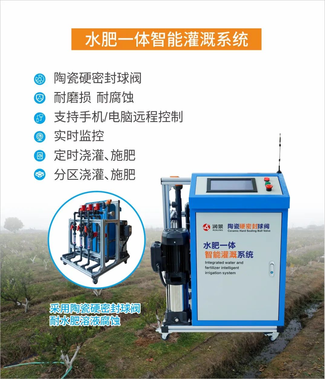 润景智灌阀的控制执行器——润景陶瓷硬密封球阀是润新公司专利技术产品(专利号ZL201320732225.7),其阀芯与阀座采用刚玉陶瓷或碳化硅材料精密加工而成,同时具有“轻扭矩、耐腐蚀、耐磨损、耐久用”等特点,被广泛应用于能源、化工、印染、光伏、湿法冶炼、锂电池生产、海水淡化、生物制药、流体智能控制、污废水处理等领域,出口全球33个国家和地区。