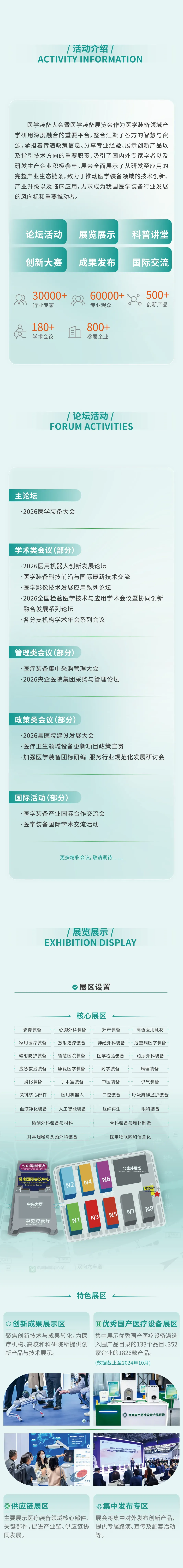 2026医学装备大会暨医学装备展览会涵盖论坛会议(含180场次左右学术会议)、创新成果发布、创新大赛、技术推介、科普活动及其他配套活动等多元板块;展区设置丰富,包含国内外先进医学装备新产品新技术、智慧医院建设等专业展区,以及创新成果展示区、优秀国产医疗设备展区等特色展区。
