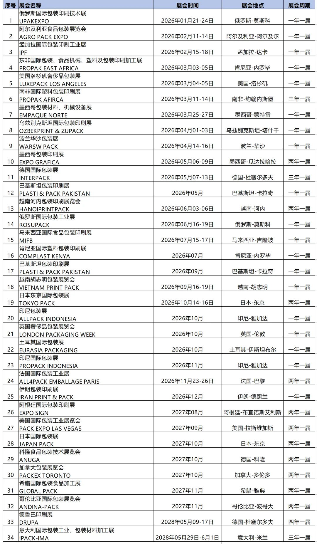 2026年全球包装印刷展会计划表