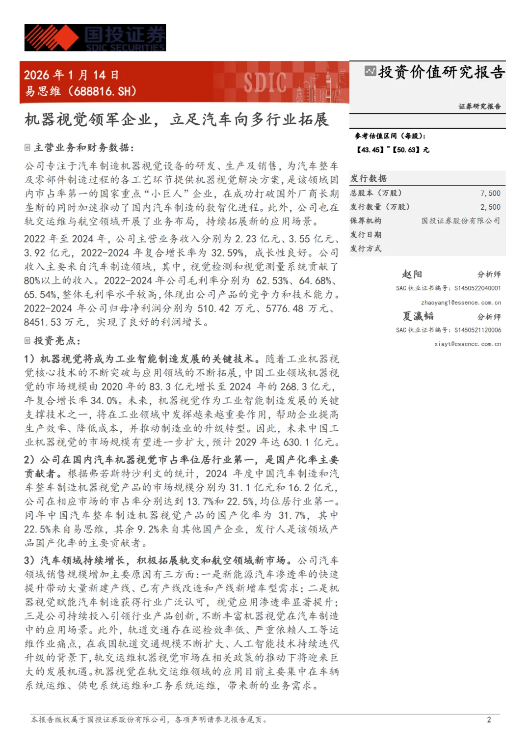 行业研究报告-《易思维688816-A股公司研究报告机器视觉领军立足汽车向多拓展》