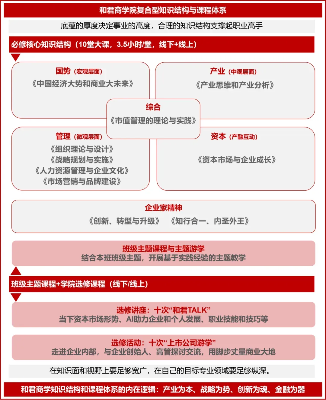和君商学院十九届“文旅会展班”课程由两部分组成,一是和君商学院的通识课程体系,二是专属产业主题班的特色课程体系。二者之间相互关联,以和君商学院课程体系教学计划为主线,辅之班级系列主题课程学习。