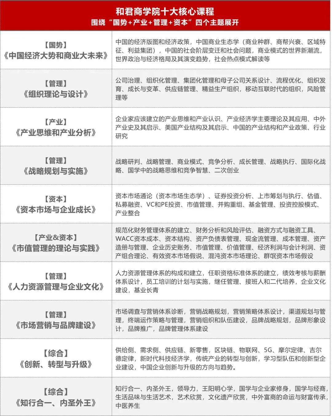 十大主题,每月一讲,每讲4个课时(45分钟/课时),当月某个周末的下午2:00–5:30举行。教学周期一年12个月,除去1个月寒假,累计10讲,共40个课时,涵盖“国势+产业+管理+资本”的知识体系。