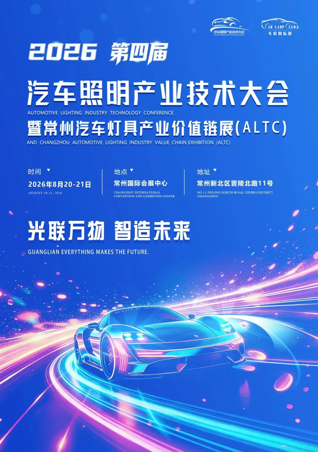 2026年8月20-21日,第四届ALTC汽车照明产业技术大会暨常州汽车灯具产业价值链展再度启航,以「光联万物·智造未来」为主题,汇聚全球汽车照明产业链精英,共探行业新趋势,共筑产业新未来。