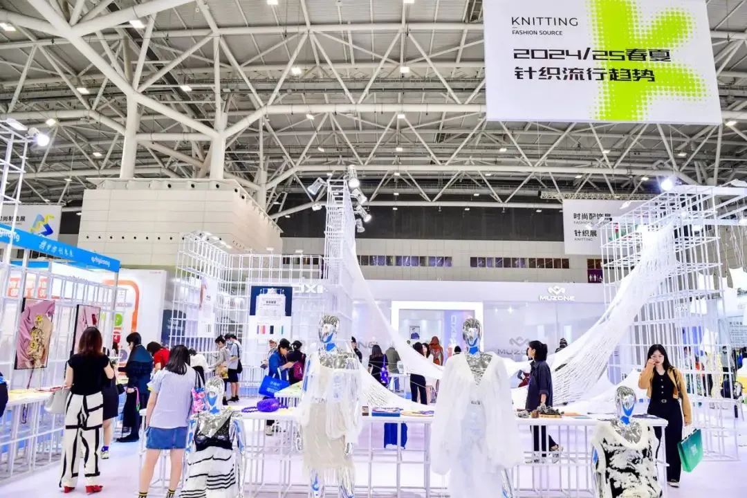 以“像素织外”为核心主题的FS 24/25春夏针织流行趋势区,涵盖“智能秘钥、永续共生、都市减法、釉碟新画”四大细分趋势主题,呈现了近200款原创织片,通过色彩、织片、成衣、家居、汽车内饰、3D毛衣橱窗及跨界作品的交织融合,为到场的设计师及产品开发人员提供了全新的创作视角。