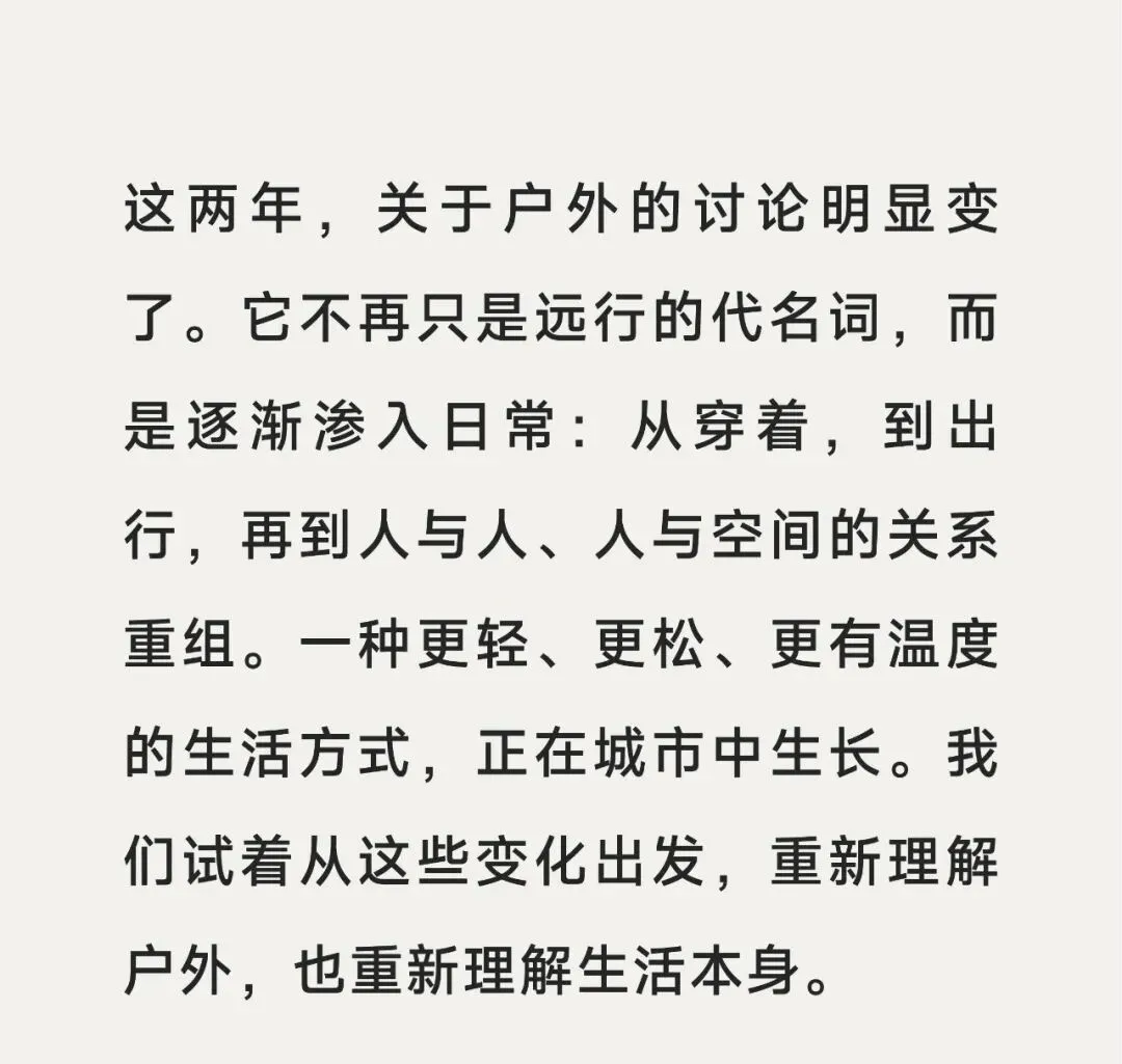 很长一段时间里,“户外”意味着出发——去山里、去海边、去一段需要计划和准备的远行。现在,它更像一种正在被改写的生活结构。