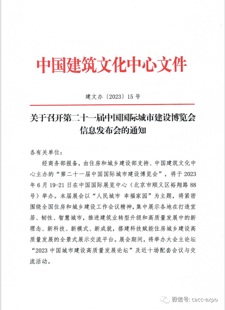 中国国际城市建设博览会(以下简称:中国城博会)由商务部批准,住房和城乡建设部支持,中国建筑文化中心主办,城博会集行业主管部门、相关学协会、权威媒体之力,是展示城市建设成就、发展方向的行业盛会,在已经成功举办的展会中,始终致力于为城市人民政府、行业主管部门、相关企业提供规格高、影响大、效益好的集中宣传、展示、交流、合作平台。中国城博会是联合国推动设立的“世界城市日”重要展示基地,展示城市形象和建设成果,举办活动周共同宣传、互动。