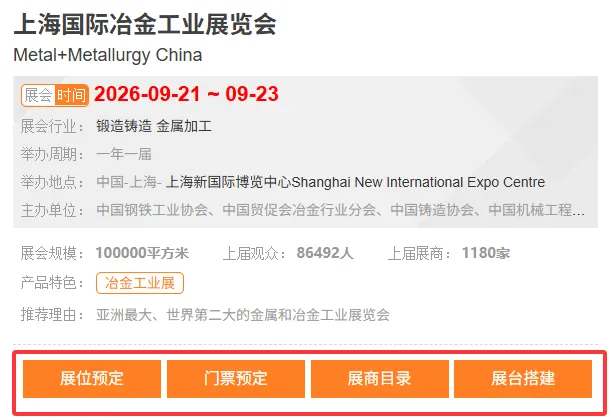 上海国际冶金工业展览会Metal+Metallurgy China【展位预定、门票预定、展商目录、展台搭建、差旅行程、签证、翻译、物流运输、补贴申报】