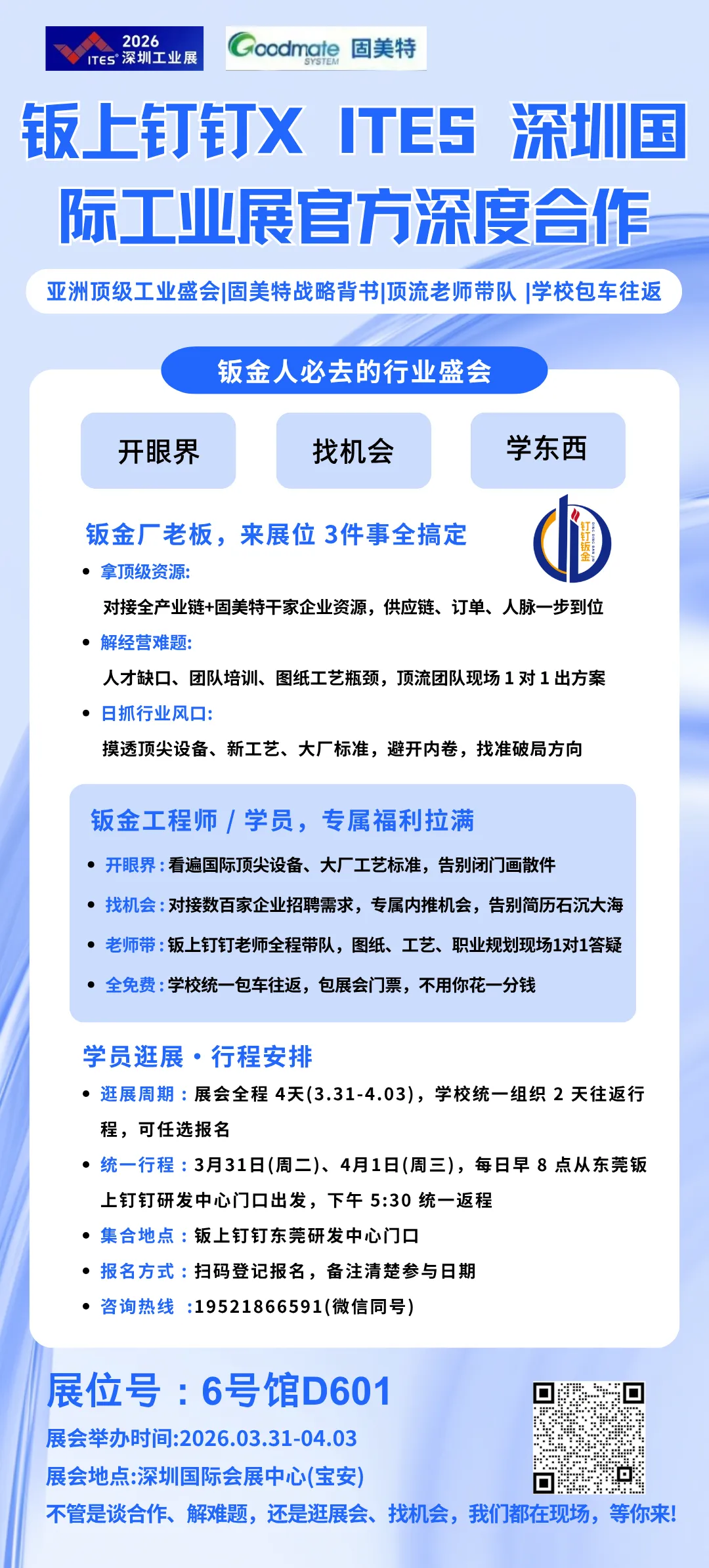 这不仅仅是一场展会,更是中国制造活力的“阅兵场”。面对价格内卷,如何“向工艺要成本,向技术要效率”?为了帮助钣上钉钉的学员们开阔眼界、对接资源,钣上钉钉技术服务公司特别组织了“免费逛展专属团”,3月31日、4月1日连续两天发车,带你直击现场。