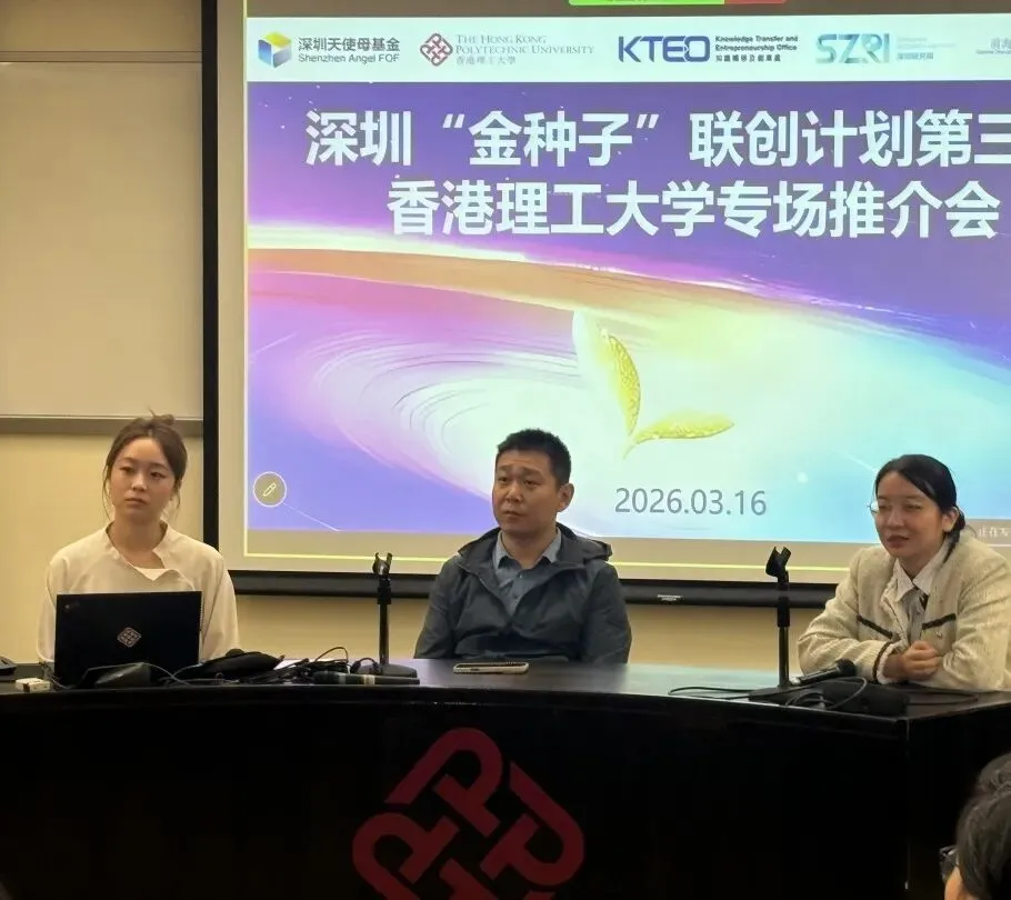 3 月 16 日,我院带领粤港澳大湾区 “创业伴飞” 实训营暨天使荟 “金种子” 联创计划(第三期)推介会走进香港理工大学,这也是金种子计划首次来到香港,本次理大专场推介会由深圳市天使投资引导基金管理有限公司(以下简称“深天使”)与香港理工大学(以下简称“理大”)联合举办,聚焦AI+极早期科创项目,宣讲团由深天使、深圳早期项目投资人、金种子往期标杆企业学员组成,吸引了50多个理大项目参会。