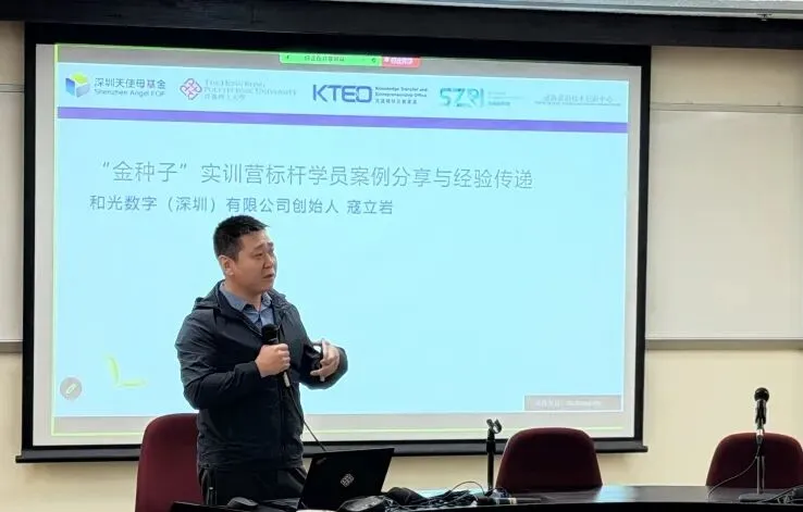 “金种子”实训营标杆学员案例分享与经验传递环节,和光数字(深圳)有限公司创始人、理大校友寇立言博士分享参营心得:实训营帮助创业者审视并重构商业逻辑、聚焦真实痛点、打磨融资表达,快速校准方向、对接到资源。也结识了同样充满激情、坚韧、同频的创业者。