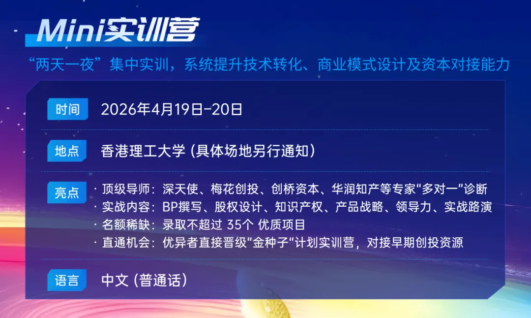 本次香港理工大学专属 Mini 实训营,是进入金种子正式营的核心入口,依托深港顶级产业与资本资源,为理大科创项目量身打造。