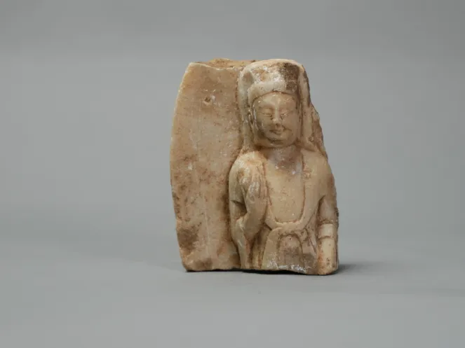 北朝白石胁侍菩萨残像,长10.5厘米,宽7.5厘米,厚3.9厘米。高浮雕,背屏式造像,上下部分、右边部分都已缺失。根据菩萨所处背屏的位置,判读可能是位于主尊佛像右边的胁侍菩萨。菩萨面容丰腴,眼睛微闭,鼻子有残损,呈微笑状。头戴宝冠,宝僧垂肩。双肩垂有披巾,披巾于腹部打结下垂,下着长裙,右手上举持莲蕾状物品,左臂下垂并于手腕处残断。造像背面光滑无刻字。