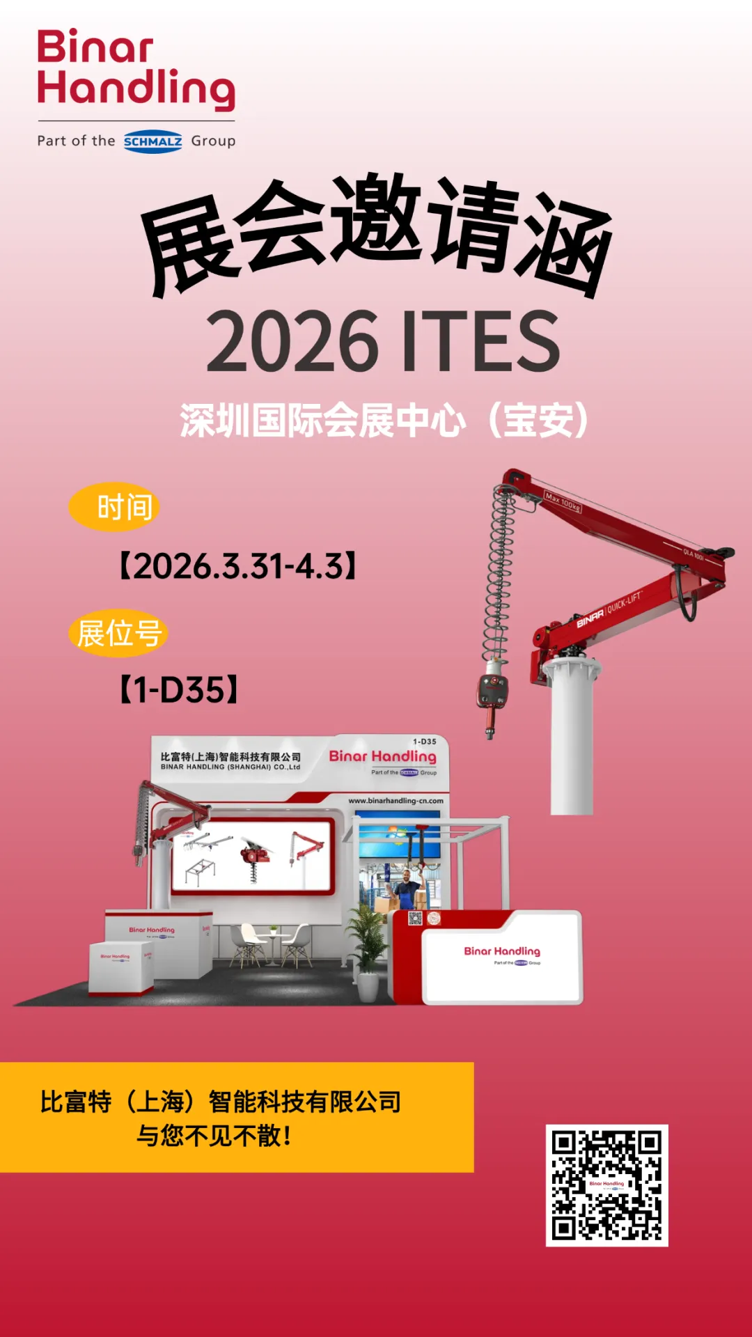 诚邀您莅临深圳国际工业展Binar Handling比富特(上海)智能科技有限公司展位(展位号:1-D35),一同探索智能搬运的无限可能!展会现场将有专业团队提供一对一的详细介绍与解答,为您带来高效、智能的工业搬运解决方案。