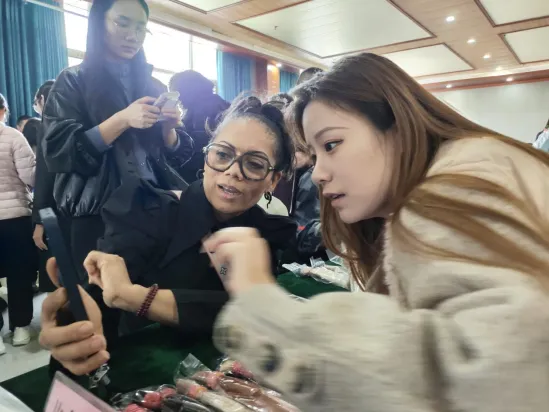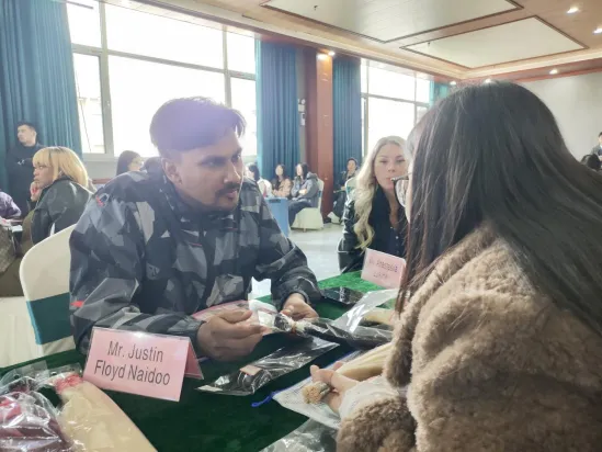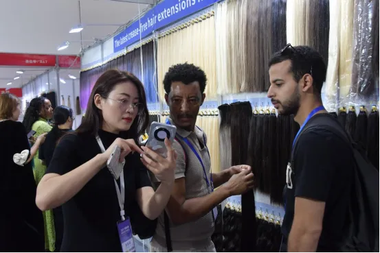 图:2025鄄城首届发制品博览会现场,发制品企业向外商展示产品。(摄影:付帮豪)