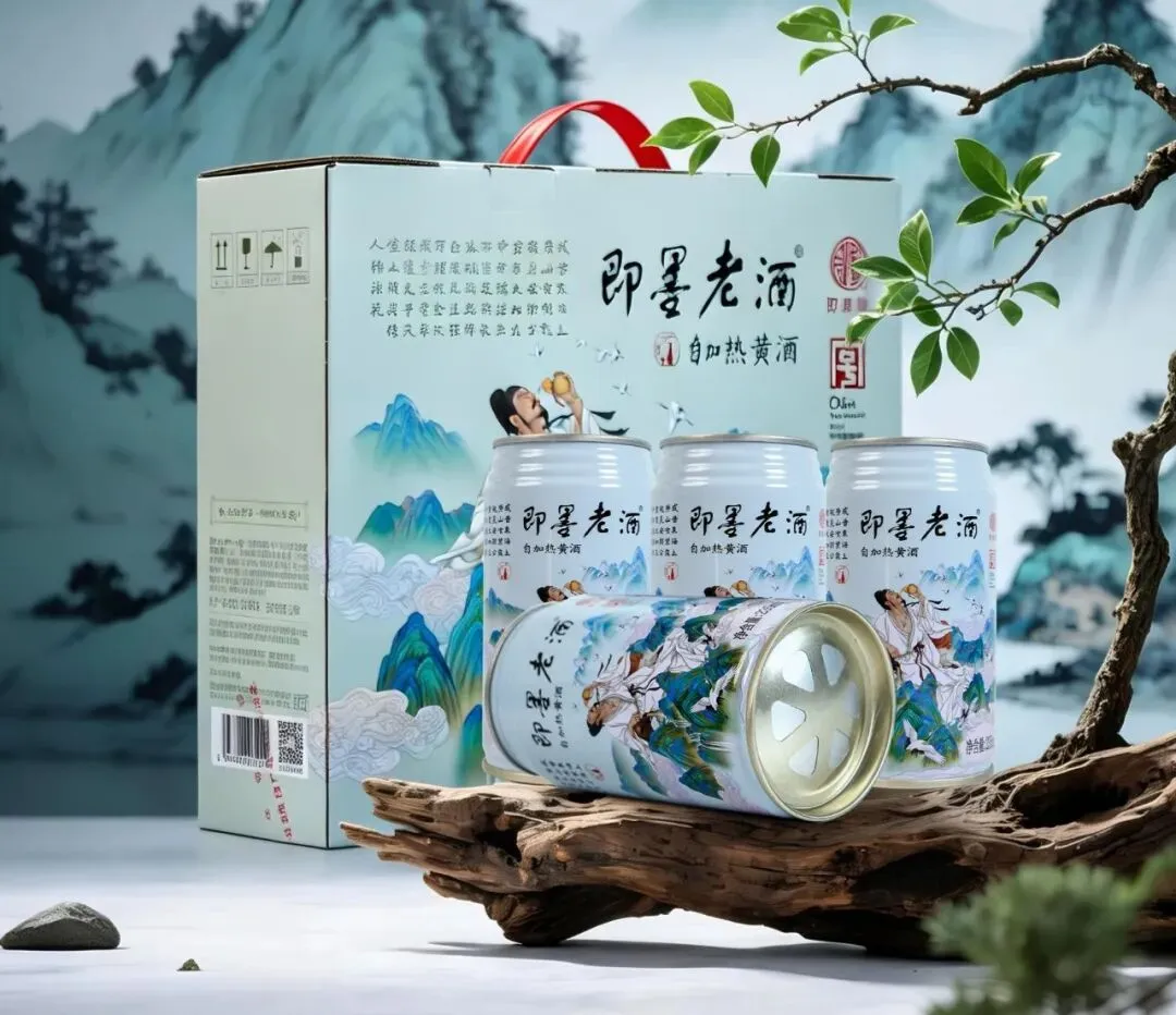 “青酌奖”获奖产品“自加热即墨老酒”,采用易拉罐包装,以自加热科技赋能,无需工具,随时随地,瞬时自热,让老酒即刻温暖。礼盒与罐体均采用国风工笔插画设计,以“崂山仙饮”为灵感,绘就诗人李白对酌崂山、仙鹤翩跹的意境,搭配传统书法题字,将即墨老酒千年文化与崂山山水相融。罐体简约雅致,礼盒端庄大气,既是自饮佳品,也是走亲访友、商务馈赠的文化之选。