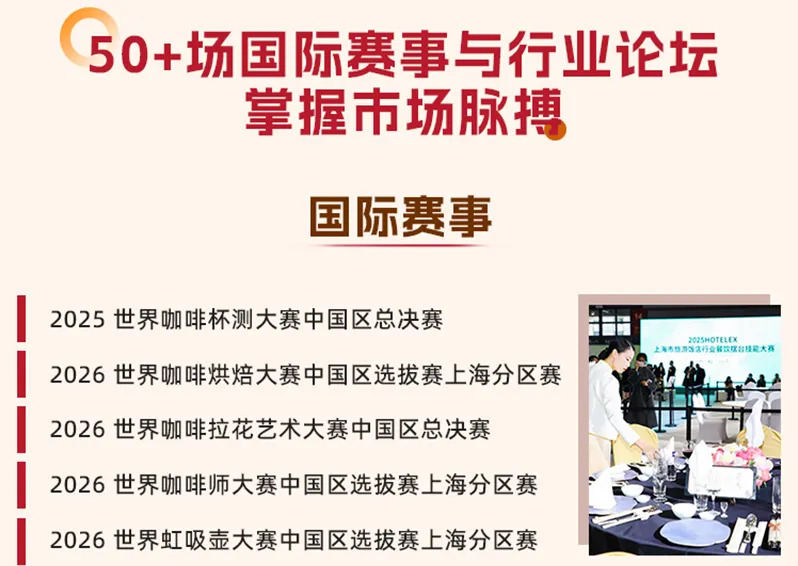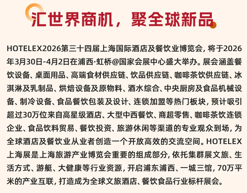 HOTELEX 2026第三十四届上海国际酒店及餐饮业博览会,将于2026年3月30日-4月2日在上海浦西·虹桥@国家会展中心盛大举办!涵盖餐饮设备、桌面用品、食品饮料、咖啡茶饮、烘焙冰淇淋、轻餐美酒、食品机械、食品餐饮包装及机械、连锁加盟等热门板块,为全球酒店及餐饮业从业者创造一个更为开放和高效的交流空间。