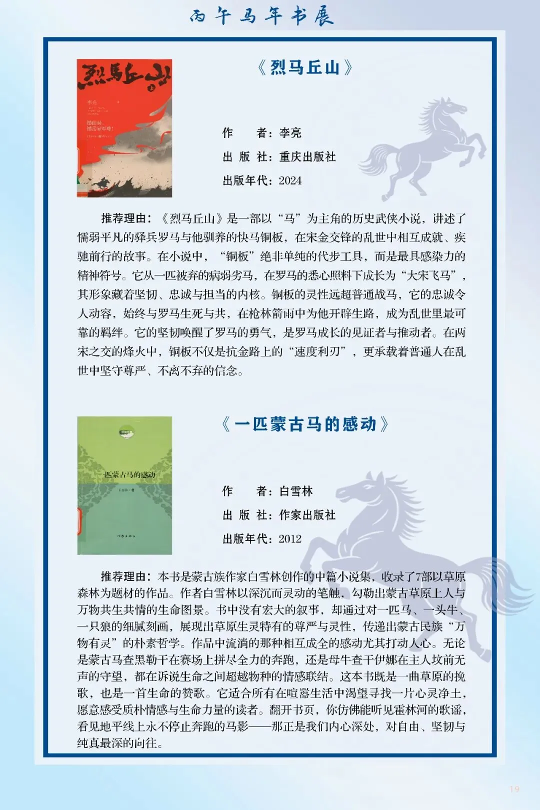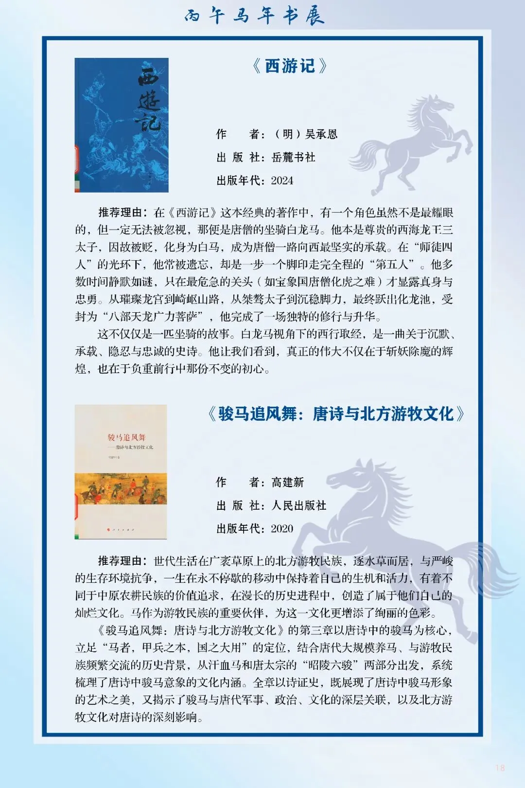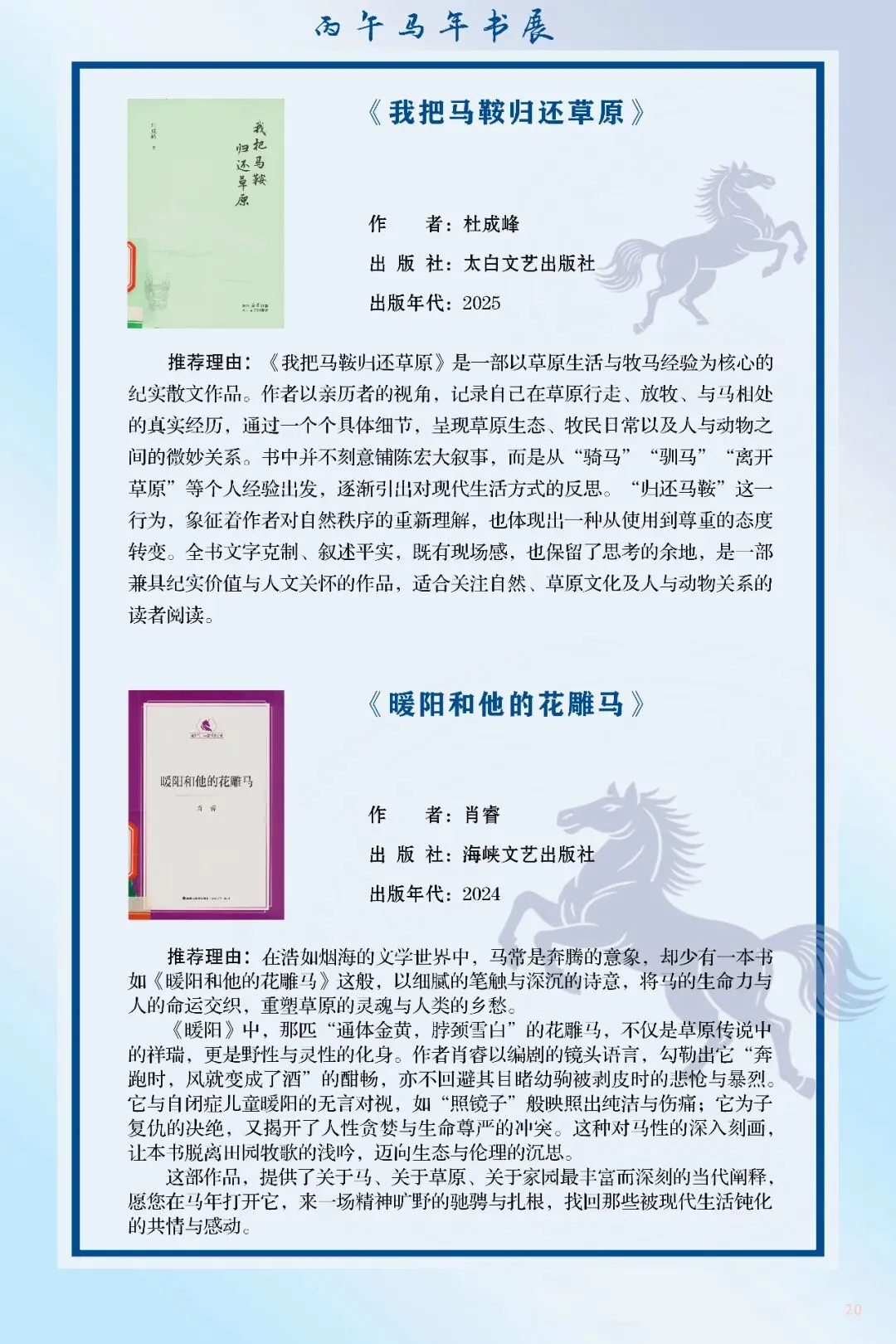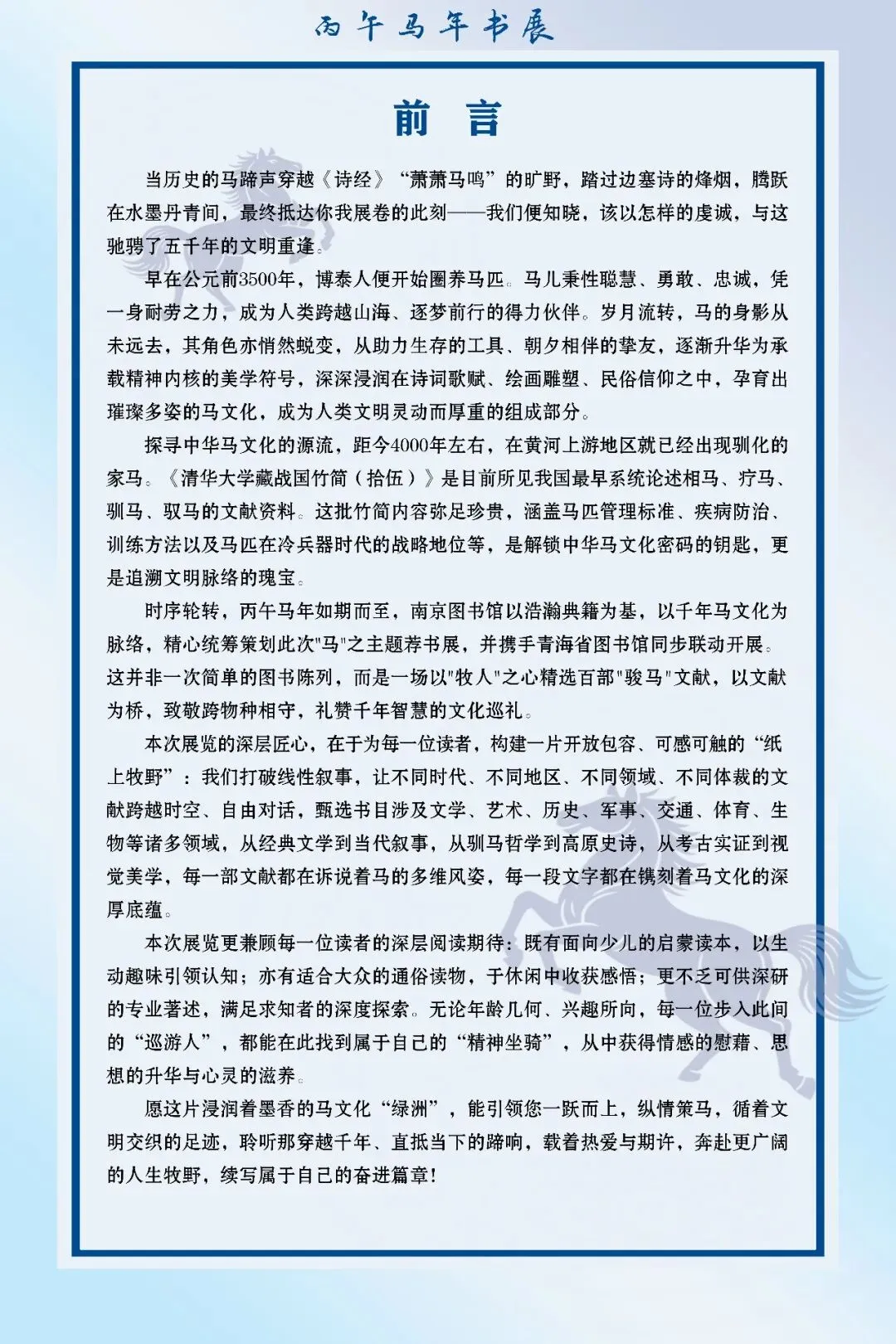 岁启丙午,春润河湟。马,作为高原文明的精神符号,是丝路古道的历史足音,更是中华优秀传统文化中奋进、昂扬、开拓的象征。本次展览由南京图书馆、江苏省图书馆学会、青海省图书馆、青海省图书馆学会、青海图书馆联盟联合举办,既有面向少儿的启蒙读本,以生动趣味引领认知,亦有适合大众的通俗读物,于休闲中收获感悟,更不乏可供深研的专业著述,满足求知者的深度探索。无论年龄几何、兴趣所向,每一位步入此间的“巡游人”,都能在此找到属于自己的“精神坐骑”,从中获得情感的慰藉、思想的升华。