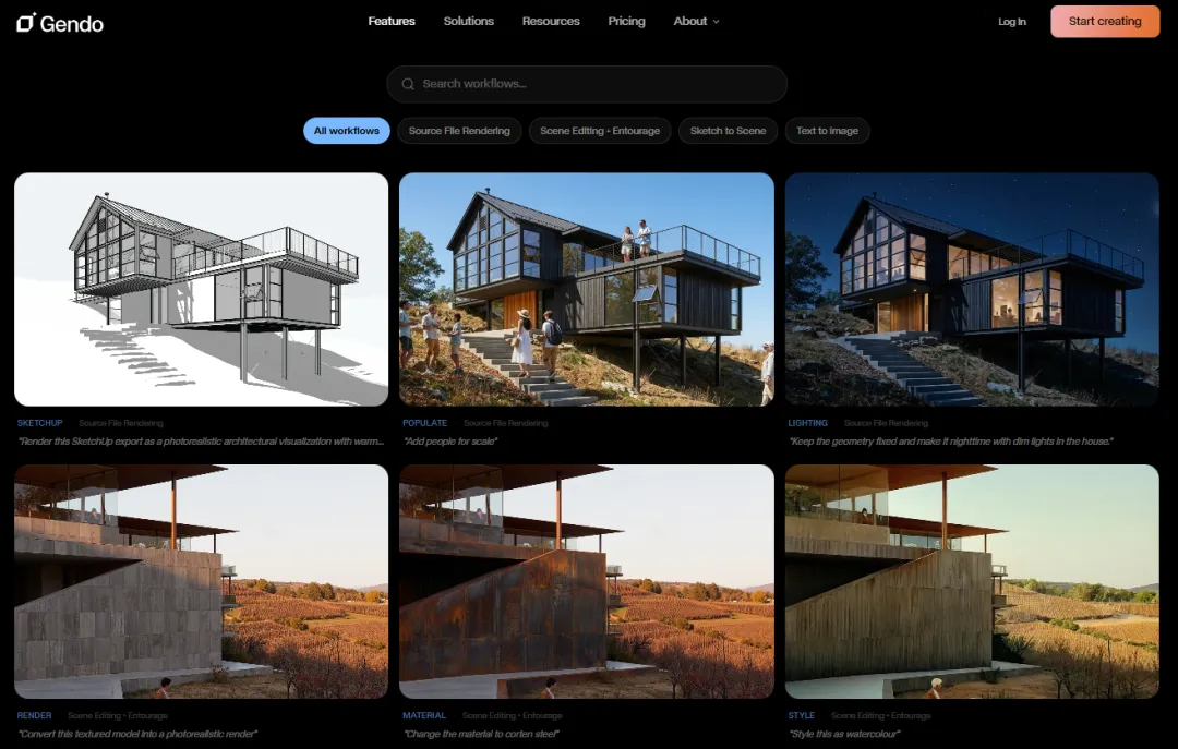 在传统的建筑设计工作流程中,效果图往往需要借助专业渲染软件或外包视觉团队完成。从模型整理、材质配置到灯光与环境设置,整个过程往往需要数小时甚至数天。对于许多设计事务所而言,高质量视觉表现不仅成本高昂,而且常常成为设计迭代的瓶颈。而Gendo所提供的生成式AI系统则尝试改变这一模式。