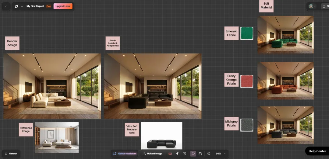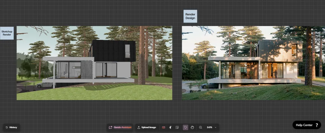 以Gendo为例,它试图将原本分散在不同软件中的流程整合到一个统一界面中。平台会记录每一次设计变化与客户评论,从而避免版本混乱问题。当设计师上传一张草图或Rhino、Revit模型导出文件时,AI可以自动为其添加材料与光照,同时保持原有设计逻辑不被改变。