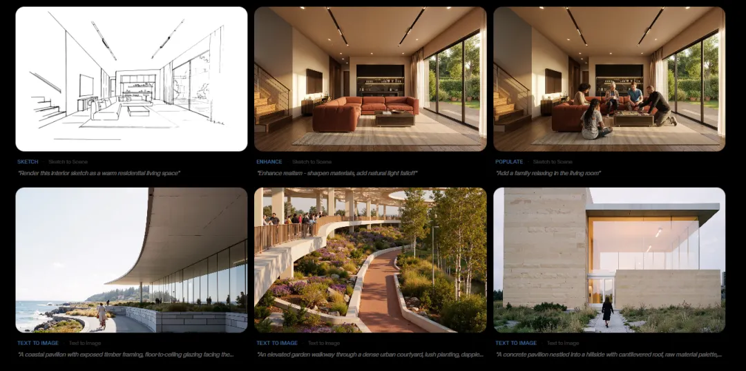 平台并不是简单地生成视觉图像,而是针对建筑设计工作流程进行了专门训练与优化。设计师可以对生成图像的具体要素进行精准控制,例如材料颜色、光照条件、结构构件甚至室内家具等。相比通用型AI模型,这种专门针对建筑设计训练的系统能够生成更加符合建筑语境与构造逻辑的视觉结果。
