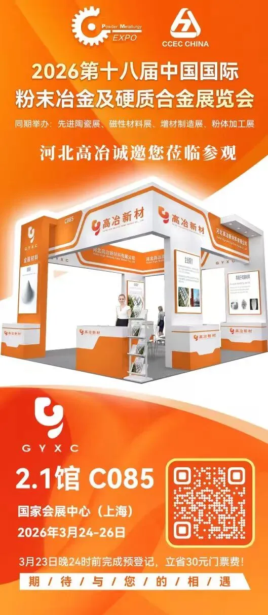 第 18 届中国国际粉末冶金及硬质合金展览会(PM CHINA 2026)将于 2026 年 3 月 24 日 — 26 日在上海国家会展中心盛大举办。河北高冶新材料有限公司将携多项前沿技术与核心产品再次亮相本届展会。