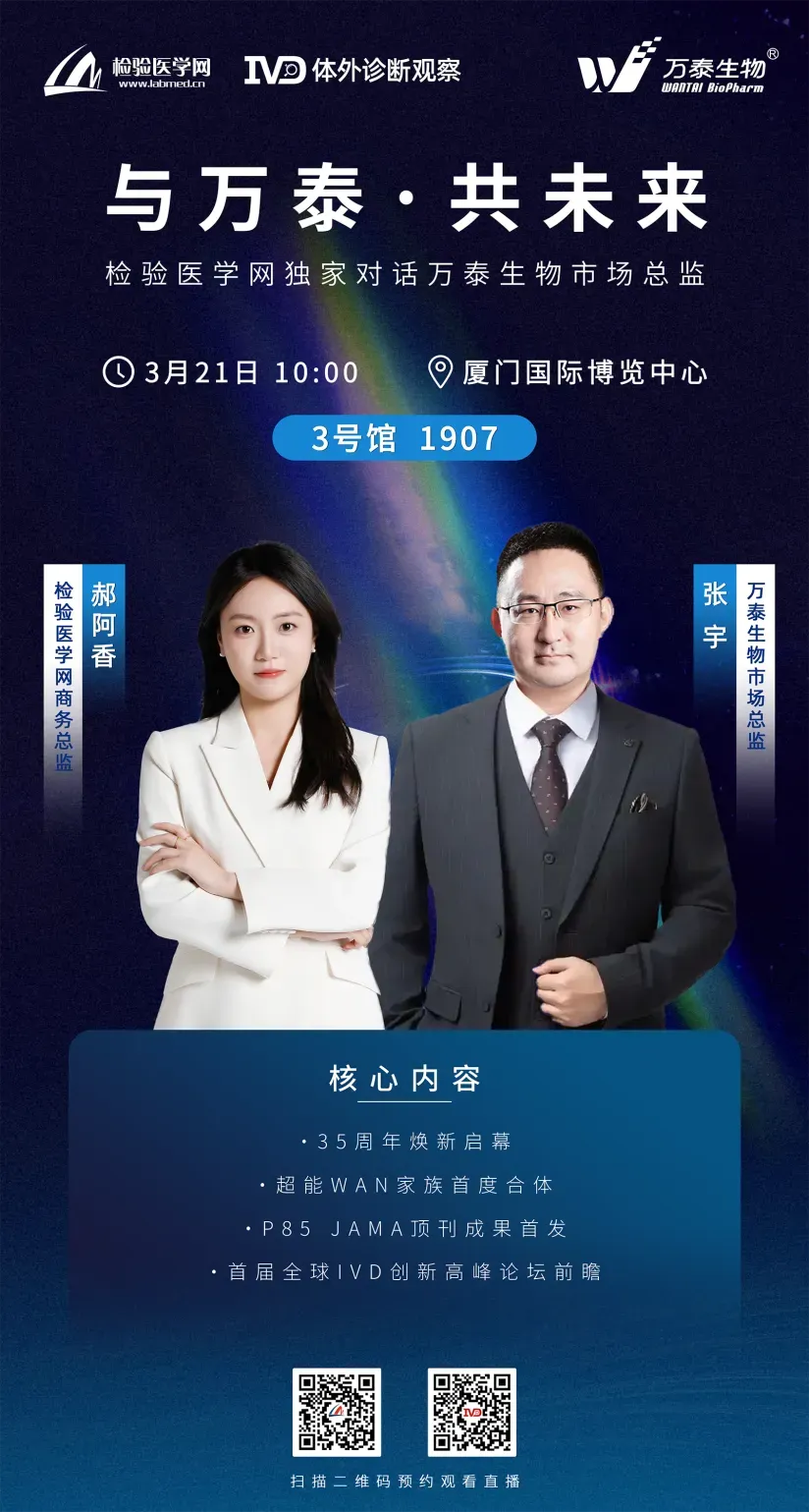 3月21日,厦门CACLP展会期间,检验医学网&体外诊断观察将对万泰生物高管开展深度专访,围绕行业趋势与企业新品等展开交流,欢迎各位同仁预约观看,共探体外诊断发展新机遇。