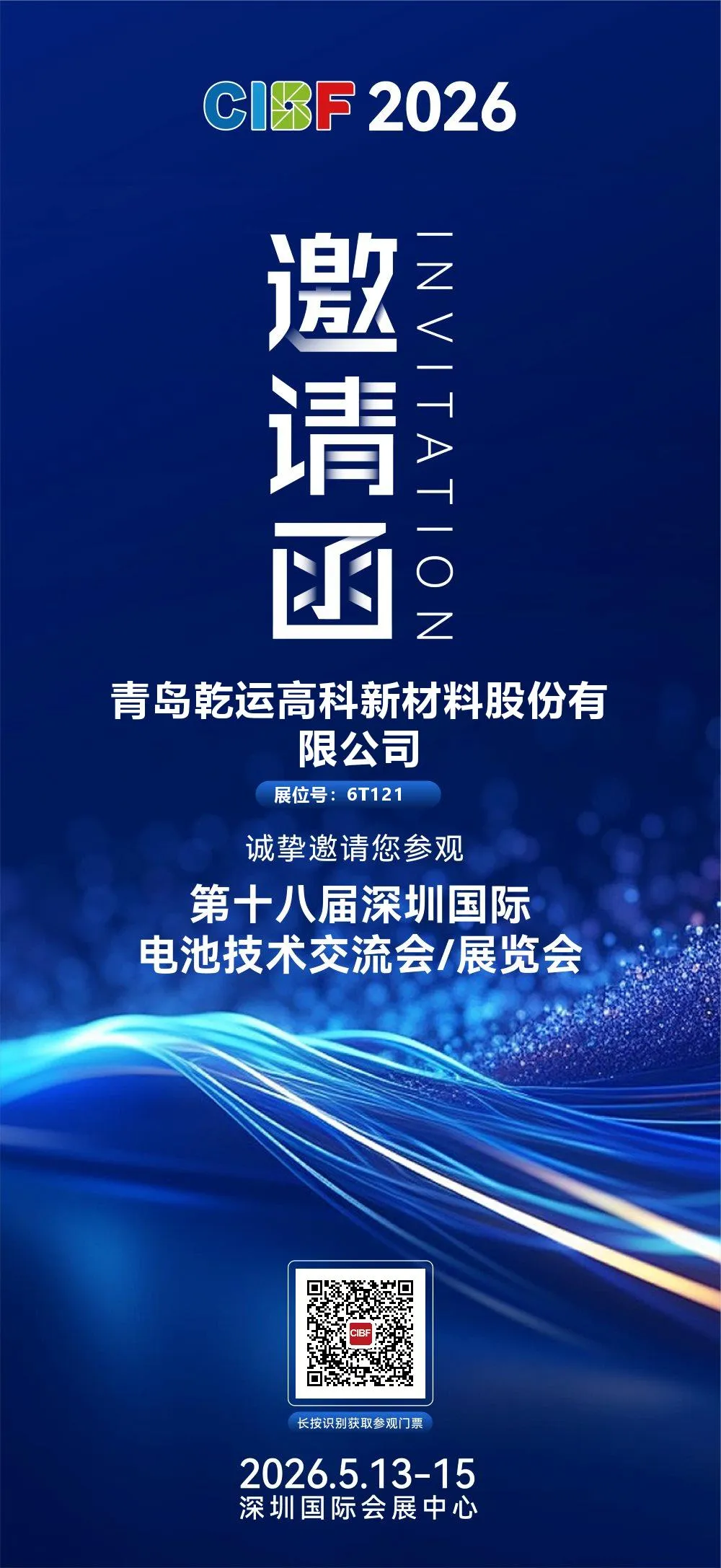第十八届深圳国际电池技术交流会/展览会(CIBF2026)即将盛大启幕。届时,乾运高科将携前沿研发产品精彩亮相,欢迎业界同仁前来交流专业技术、对接精准需求,共谋绿色发展新篇章。