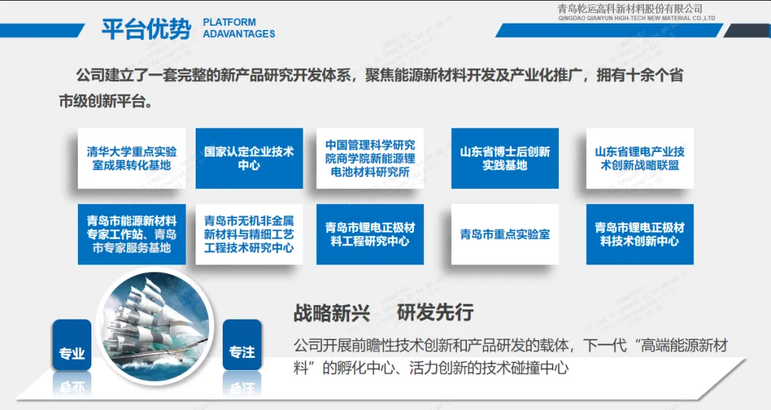 作为锂电正极材料的专精特新“小巨人”企业、高新技术企业,青岛乾运高科新材料股份有限公司深耕锂电正极材料行业多年,公司已入选工信部锂离子电池行业规范企业、山东省新材料领军企业50强、首批“好品山东”品牌企业等等。