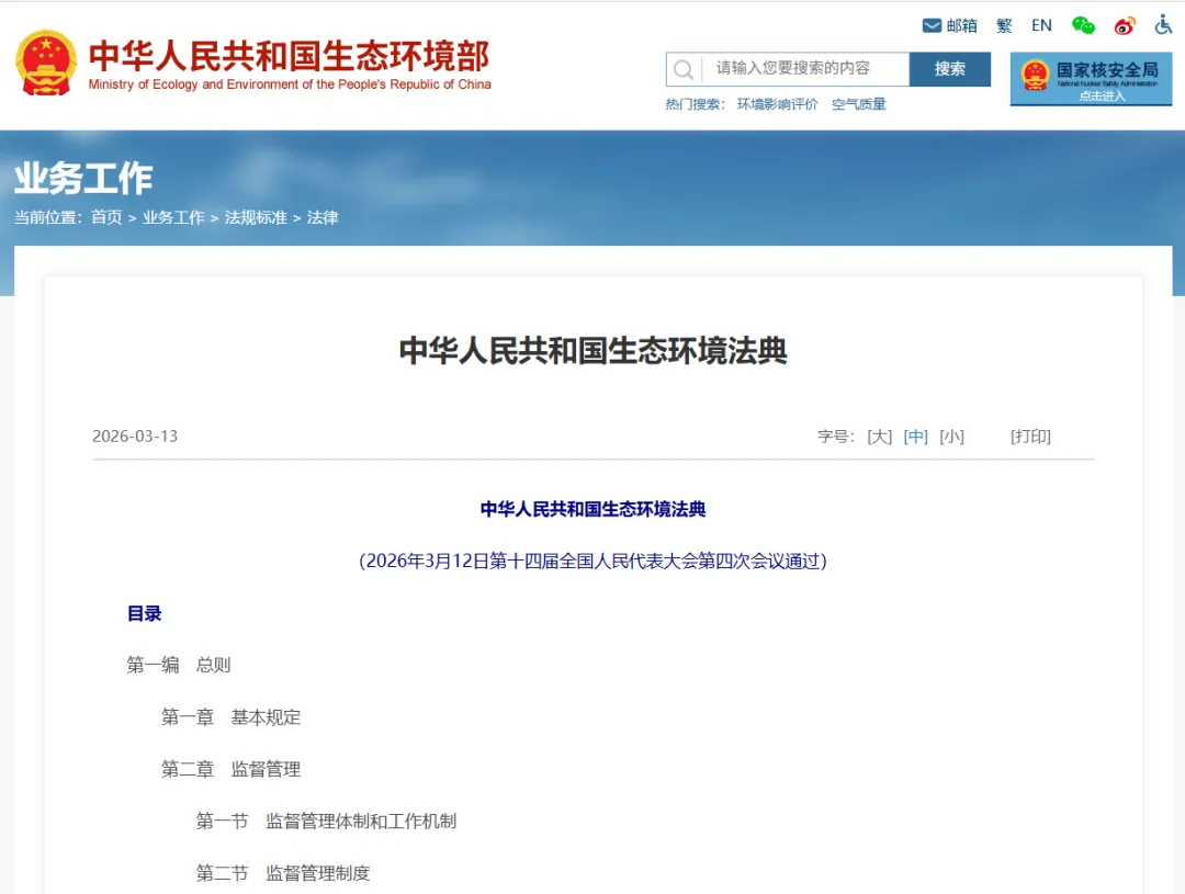 2026年3月12日,《中华人民共和国生态环境法典》表决通过,2026年8月15日正式施行。这是我国第二部以“法典”命名的基础性法律,将污染防治、生态保护、绿色低碳、法律责任统一整合,对排污企业而言是责任更严、监管更紧、处罚更重的全新合规时代;对环保运维、在线监测运维、污染治理设施运维全链条带来规则重塑、责任压实。